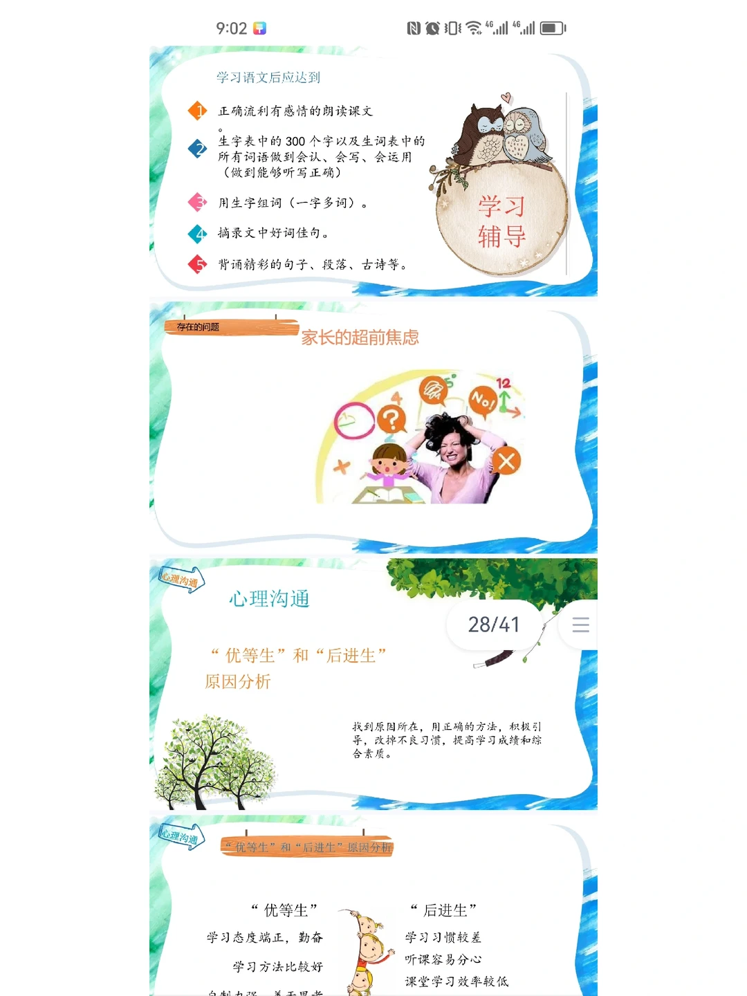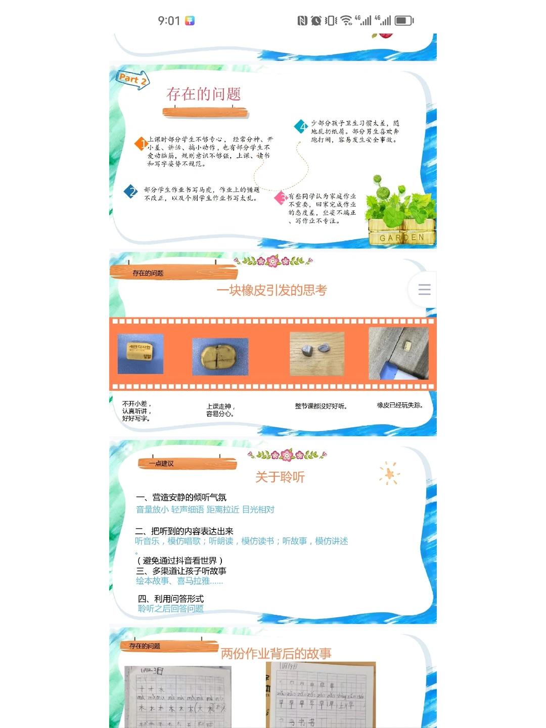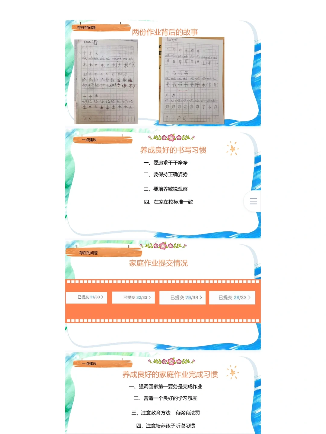 一块橡皮引发的思考、一份作业背后的故事、家庭作业提交情况、课桌里面的秘密、一组数据给予的思考、家长的超前焦虑、牵着蜗牛去散步