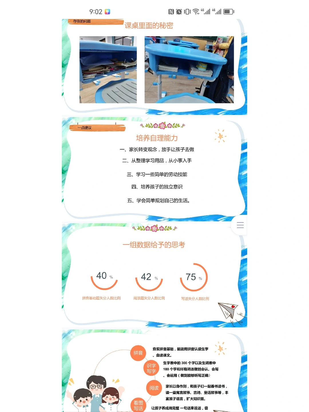 班主任发言:需要家长配合的地方、班级概况(课前准备、端正坐姿、有序就餐、快乐运动、收获友谊、收获成绩)