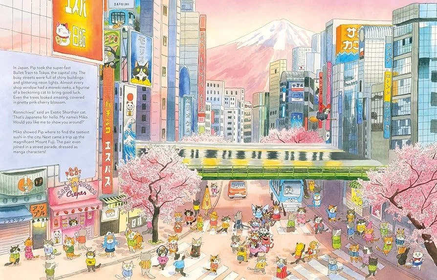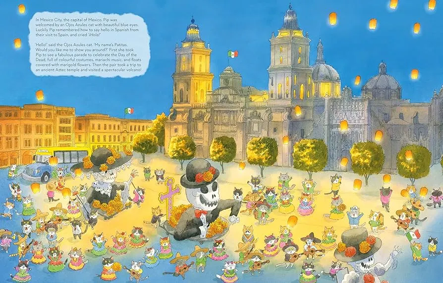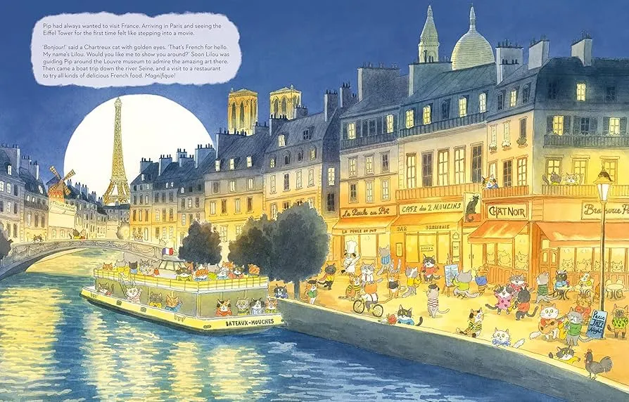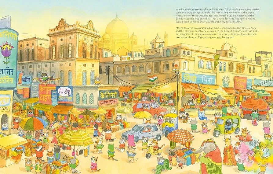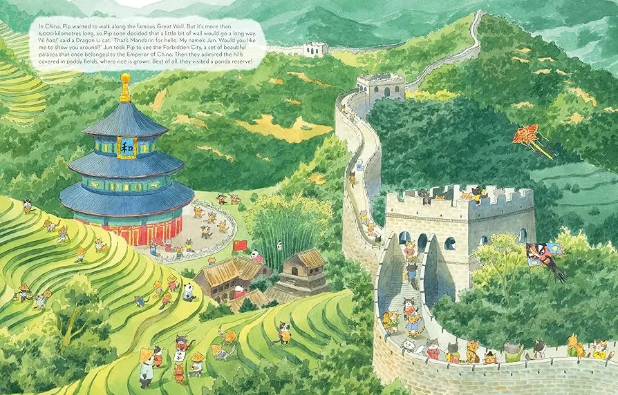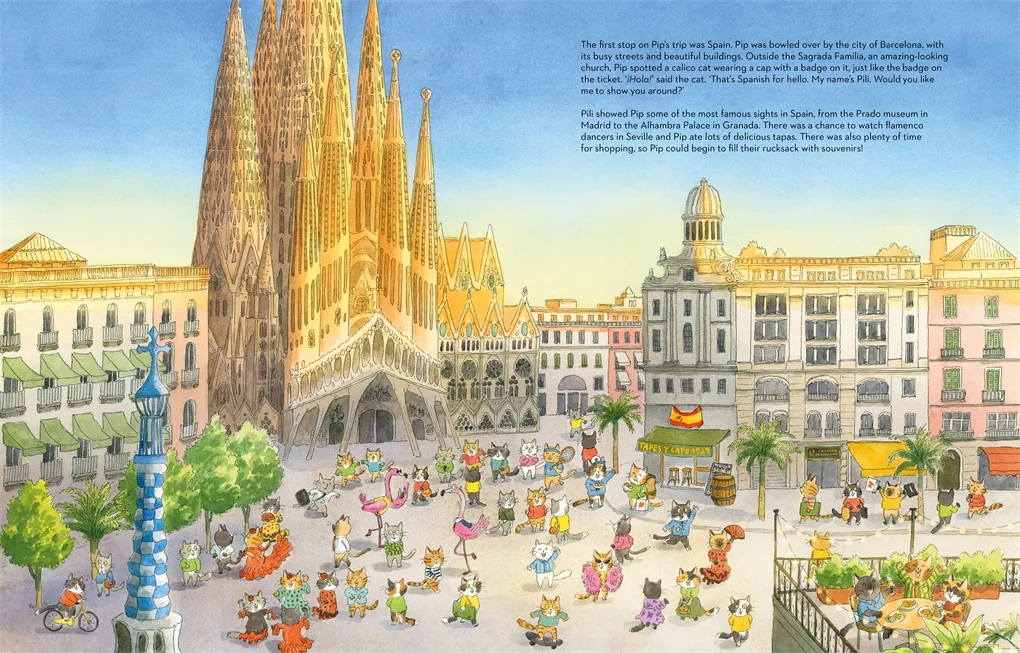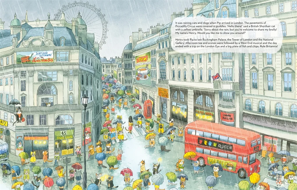 插画师 Lorenzo Sangio 用细腻如明信片的笔触,将每个国家的灵魂藏进画面里:埃及金字塔旁的猫咪戴着头巾,澳大利亚的袋鼠与 Pip 并肩蹦跳,纽约的自由女神像下,一只穿西装的猫咪正招手…… 每一页都像一场微型文化盛宴,藏着建筑、美食、服饰的小彩蛋,让孩子在翻页间悄悄记住世界的模样。