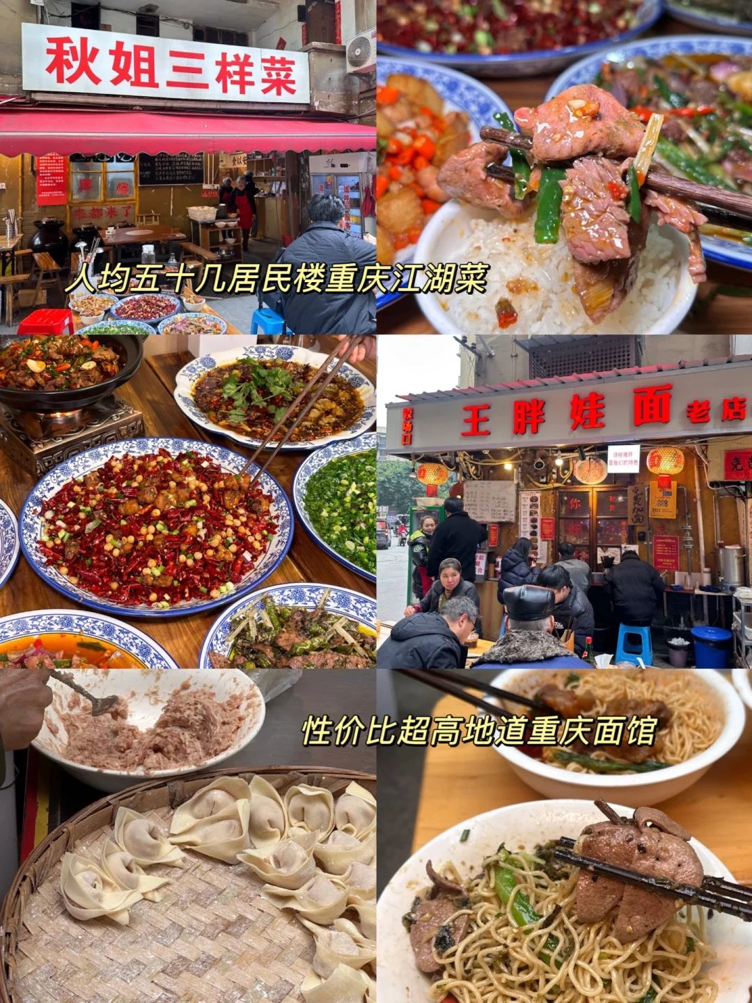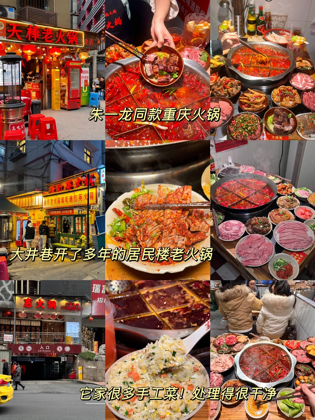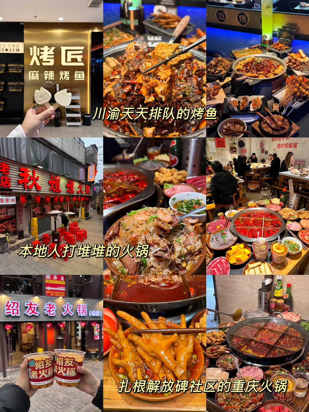 🤤常去的几家更是值得闭眼冲 📌烤匠麻辣烤鱼(观音桥大融城店):经典麻辣烤鱼、芝士烤红薯 📌秋孃孃火锅(老店):卤肥肠头、卤耙鸡爪 📌绍友老火锅:糯香鱿鱼、猪油蛋炒饭 📌天棒老火锅:天棒三宝、肥肠炒饭 📌唐红英火锅(临江门店):红英炒饭、挑挑牛肉 📌惠火锅(解放碑店):手工嫩肉片、手切鲜牛肉 📌秋姐三样菜:山城毛血旺、海带蹄花汤 📌王胖娃面:莲藕抄手、烧椒猪肝面