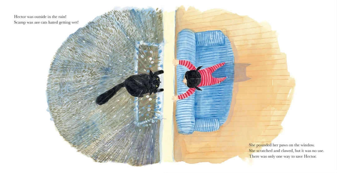 有一天,赫克托不见了。小淘气从梦中惊醒,心急如焚地四处寻找。最后她凭借新学会的攀爬技能爬上沙发望向窗外。只见赫克托在外头,暴雨将至,猫咪怕雨,紧急时刻,小淘气急中生智,成功把赫克托救了回来。