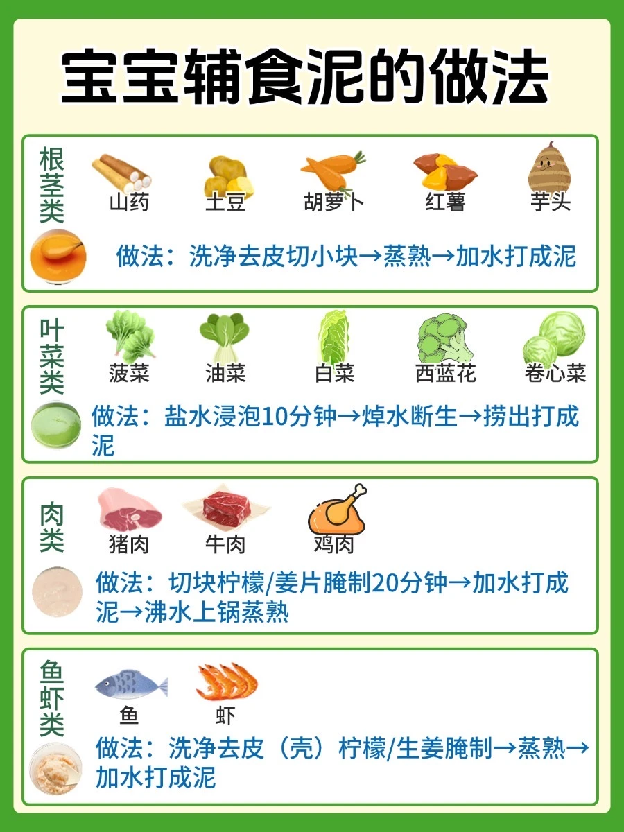 ✅阶段二:7-8月的辅食为泥糊状、碎末状食物。
