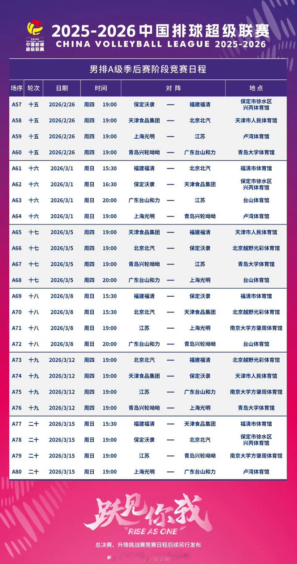 中国女排中国女排超级联赛 男女排季后赛赛程出炉。