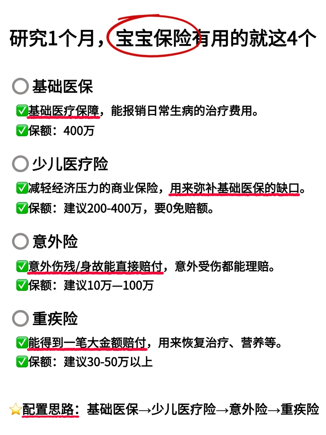 常见的保险有少儿医疗险、意外险和重疾险,每种保险保障范围和用途不同,配置顺序是先办医保,👉🏻少儿医疗险→意外险→重疾险