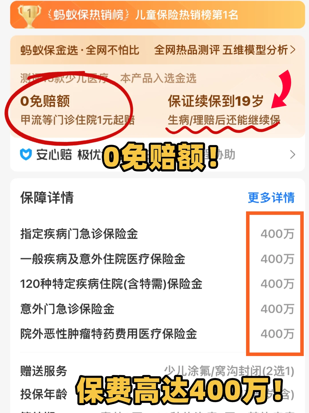 门急诊按照80%比例赔付;生病住院1万以上部分按100%⽐例赔付;针对白血病等120种少儿特定病,赔付比例是100%,还能享公立医院特需部、国际部住院服务。并且能从出生续保到19岁,以续保的事儿就不用操心了,均不限社保目录,医疗保障400万赔付限额很香了