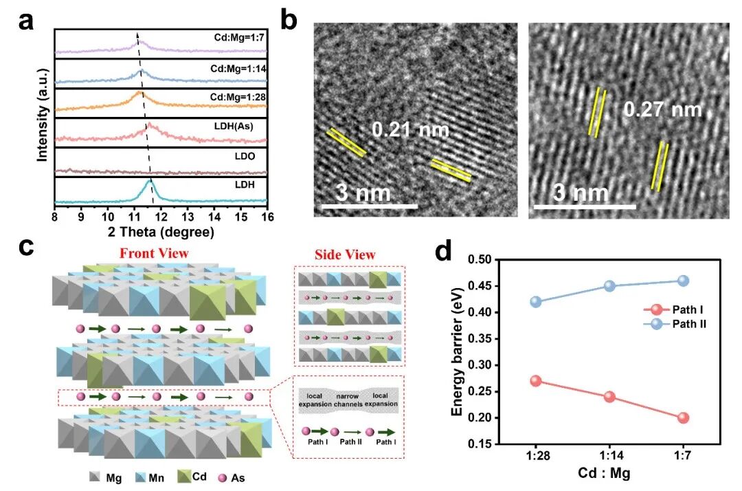 图4(a–b)CdMgMn-LDH(As/Cd)的晶格膨胀表征;(c–d)Cd²⁺同晶取代后As