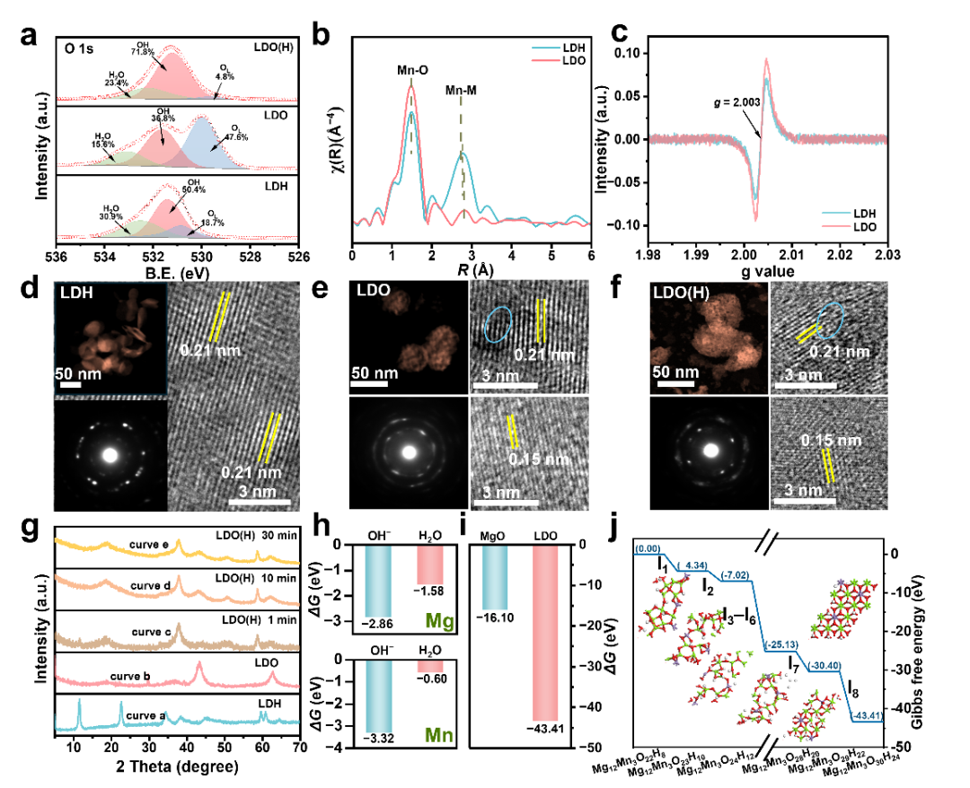 图2LDO的体相羟基化。(a–f)热处理激活LDO表面的氧空位和金属缺陷;(g)不同时间下LDO羟基化的结构;(h–j)羟基化的作用位点和吉布斯自由能变化过程。