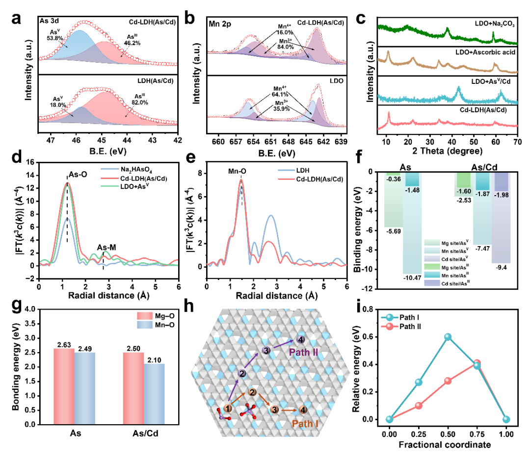 在AsIII/Cd²⁺共存条件下,AsIII在LDO(H)表面的氧化是触发LDO到LDH(AsIII)拓扑转变的先决步骤(三级拓扑转变),该过程中电子从AsIII转移到Mn⁴⁺不仅实现了As的氧化,所形成的Mn³⁺是LDO复原至LDH的关键,形成的AsV进入层间,与层板MO6形成角/边共享键,提高稳定性形成超稳矿化结构。DFT计算进一步证实Mn与AsIII较强的结合能力驱动氧化发生,并且AsIII的扩散路径计算说明AsIII扩散更倾向于绕过AsV占据位点(PathI:0.6eV>PathII:0.41eV)。