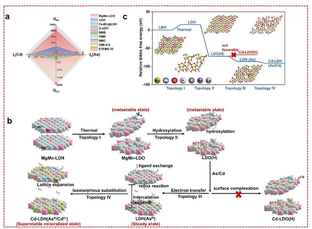 基于前期工作,北京化工大学/衢州资源化工创新研究院的段雪院士团队的史文颖副教授、孔祥贵副教授等研究人员,在近日发表的NatureCommunications文章中,以“超稳矿化”挑战复合重金属高度污染的土壤/场地修复,并揭示了“超稳矿化”深层次的科学本质。充分利用LDHs独特的拓扑转变性质,通过调变其结构组成与比例,构筑了MgMn-LDH超稳矿化剂,在空间和时间上将AsIII的氧化过程与Cd²⁺的吸附过程解耦,从而有效缓解竞争抑制效应,实现了砷镉共存体系中的协同高效矿化。基于此,MgMn-LDO在砷镉共存体系中展现出了优异的矿化性能:对AsIII和Cd²⁺的吸附容量分别达821.7mg/g和1895.6mg/g,且对砷的矿化速率较单一组分体系提升181倍。此外,实际矿山废水和重度污染土壤修复实验进一步验证了该材料的实际应用潜力。