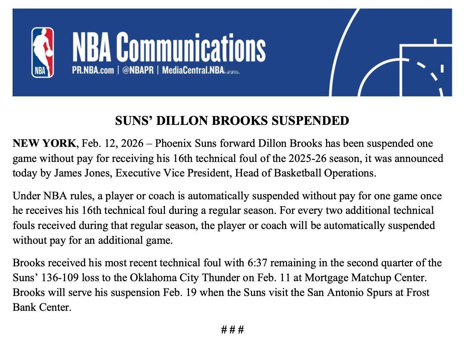 狄龙·布鲁克斯昨天吃到了本赛季个人第16次技术犯规,今天联盟发布公告对他禁赛一场。