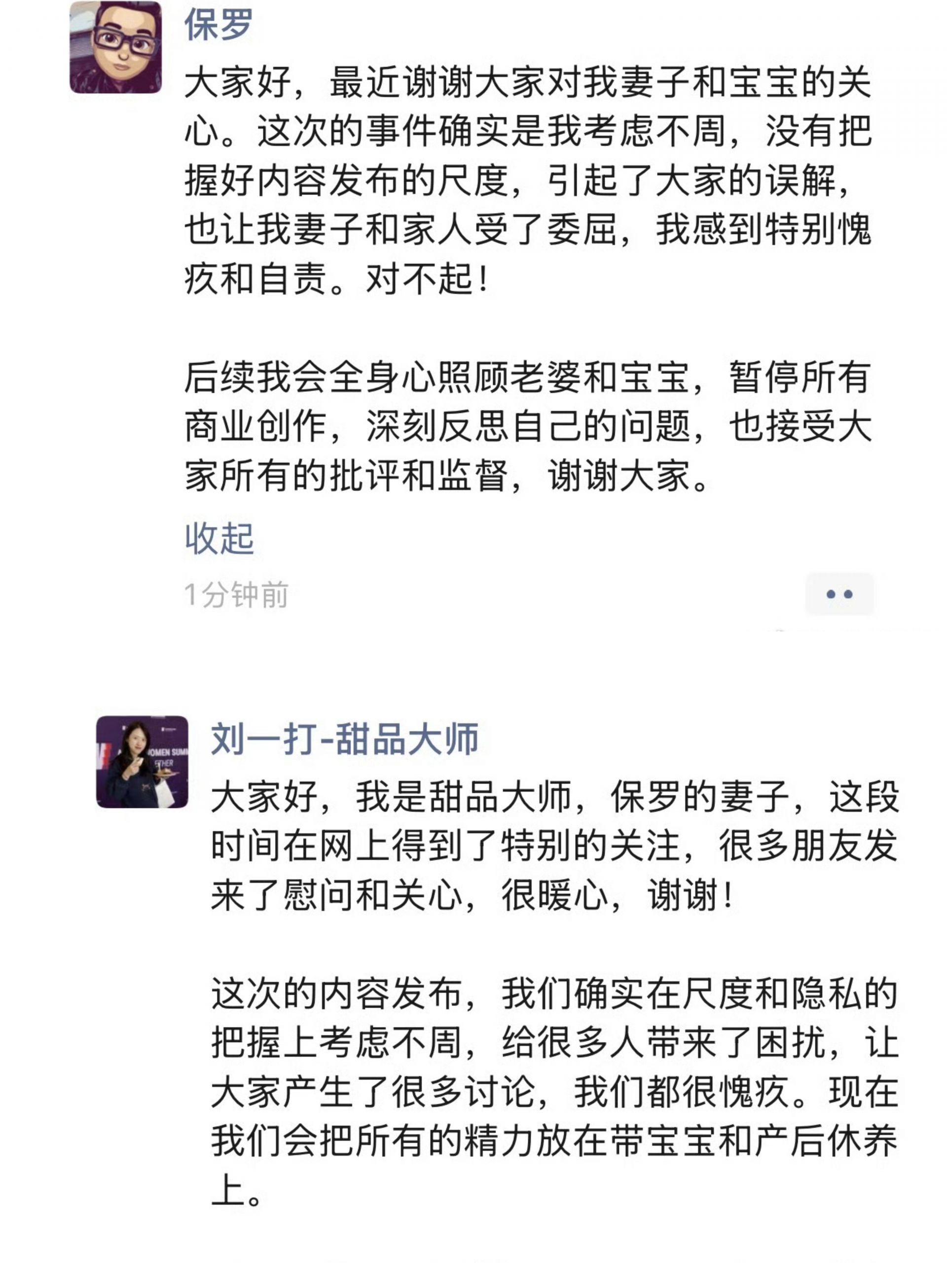 声明中称:“首先,我们由衷理解网友对本次事件的高度关注,也完全认同大家对于女性生育权益保护、隐私边界界定以及亲密关系中彼此呵护的美好期待。网友们的各类声音,本质上是对生育这一特殊人生时刻的尊重,更是对公序良俗的坚守,这份心意,委托人保罗先生及其妻子深感认同,也十分感念。需要特别说明的是,保罗先生及其妻子承认在本次内容创作与发布过程中,确实存在“内容尺度把握、隐私边界考量等细节考虑不周”,让大家产生误解。对此,我们深感愧疚与歉意,也进行了深刻的反思。”