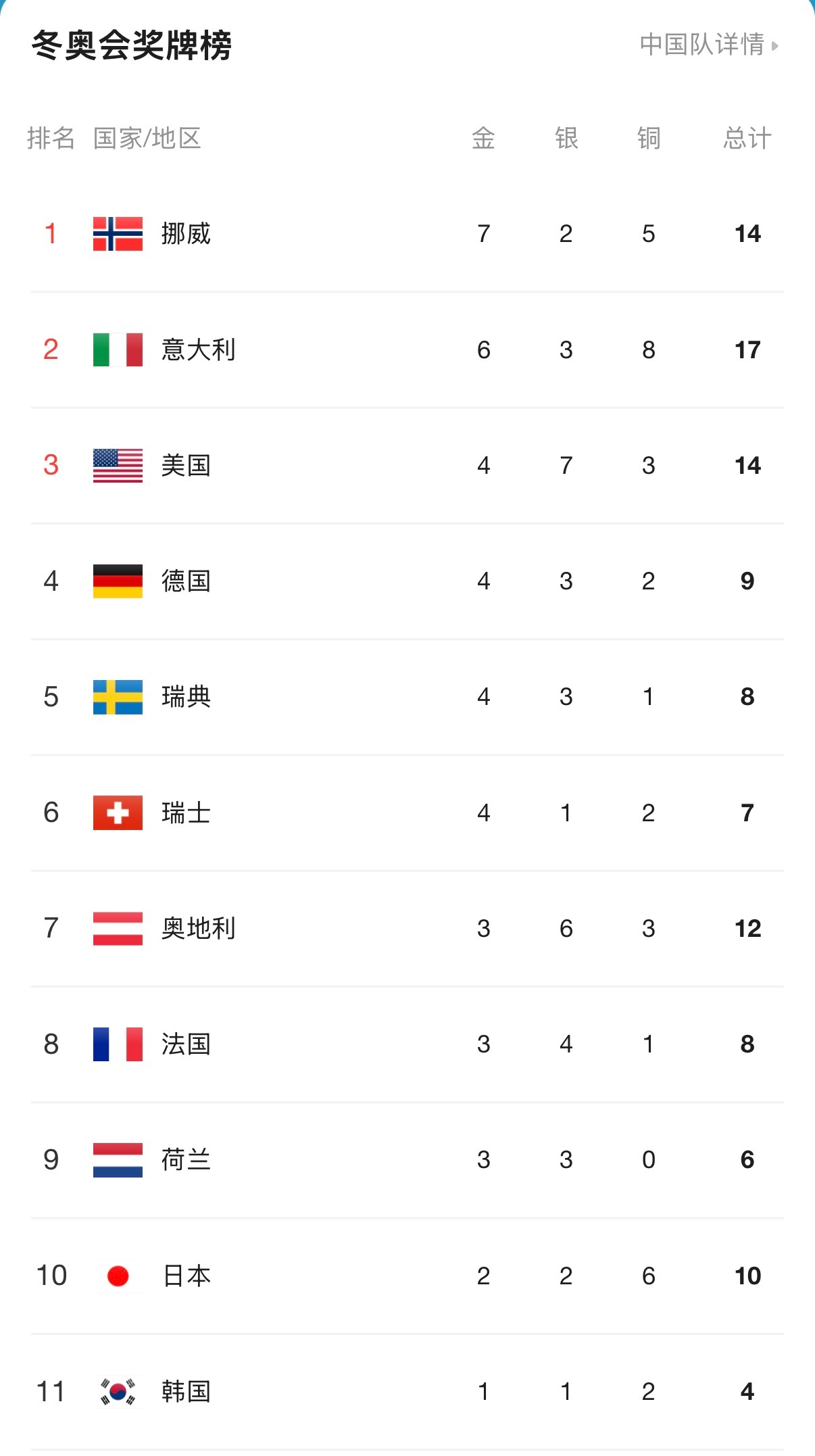 冬奥会 奖牌榜,昨晚韩国选手爆冷摘得U型池冠军后,日韩均已开胡登上金牌榜,中国队2银2铜,加油来一记金Ace吧
