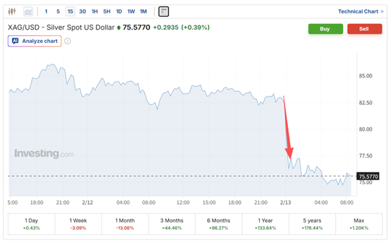 白银跌势更为惨烈,现货白银直线跳水跌超10%,价格从约83美元/盎司跌至约75美元,创下2026年以来单日跌幅最大纪录之一。