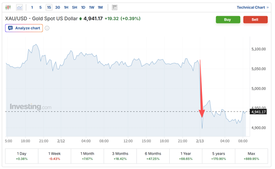 周四美盘时段,现货黄金30分钟内跌近200美元,跌幅一度高达近4%,跌破4900美元/盎司。