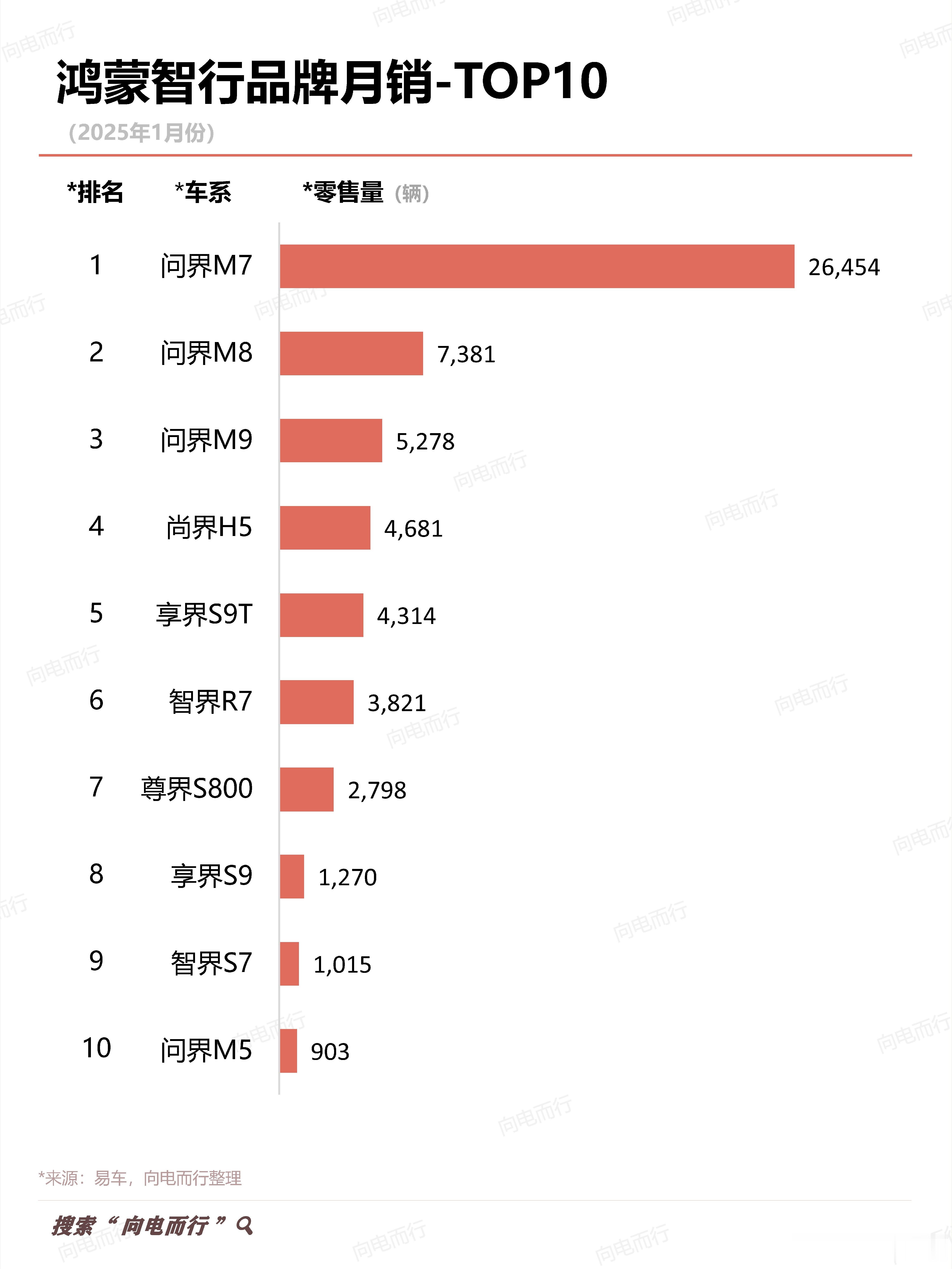 一月份销量出炉,鸿蒙智行只有一款过万,问界M7销量2.6万辆,尊界S800销量2