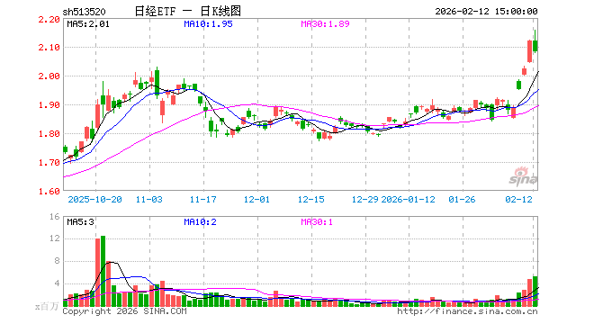 2月12日,日经ETF(513520)跌1.79%,成交额11.17亿元。当日份额增加50.00万份,最新份额为10.14亿份,近20个交易日份额增加950.00万份。最新资产净值计算值为20.51亿元。