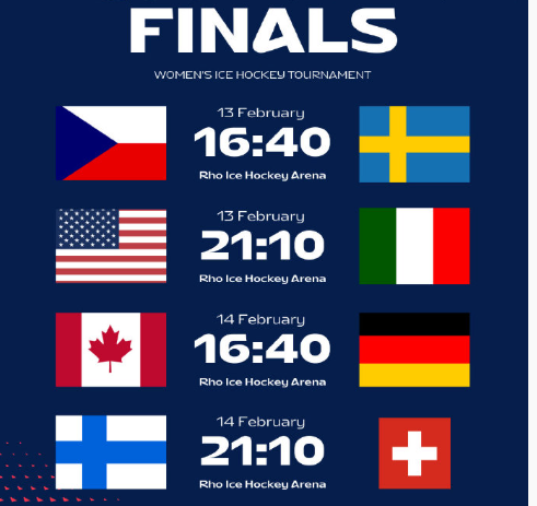 冬奥会女子冰球1/4决赛的比赛将在13号和14号举行。
