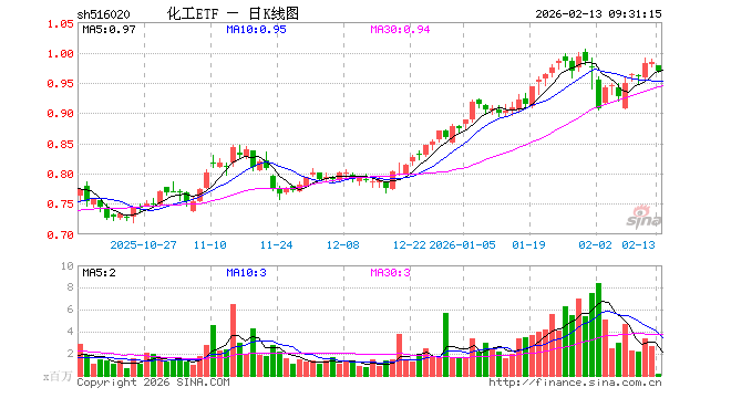 2月13日,化工ETF(516020)开盘跌0.61%,报0.978元。化工ETF(516020)重仓股方面,万华化学开盘跌1.12%,盐湖股份跌1.06%,藏格矿业跌1.14%,天赐材料跌1.10%,巨化股份跌0.03%,恒力石化跌1.26%,华鲁恒升跌1.21%,宝丰能源跌1.46%,云天化跌0.98%,金发科技跌0.16%。