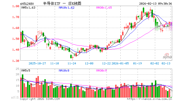 2月13日,半导体ETF(512480)开盘跌0.61%,报1.642元。半导体ETF(512480)重仓股方面,寒武纪开盘跌1.12%,中芯国际跌0.30%,海光信息跌0.89%,北方华创涨1.00%,兆易创新涨0.00%,澜起科技跌0.78%,中微公司跌0.63%,豪威集团跌0.42%,拓荆科技跌0.34%,紫光国微跌0.83%。