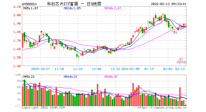 2月13日,科创芯片ETF富国(588810)开盘跌0.11%,报1.892元。科创芯片ETF富国(588810)重仓股方面,中芯国际开盘跌0.30%,海光信息跌0.89%,寒武纪跌1.12%,澜起科技跌0.78%,中微公司跌0.63%,拓荆科技跌0.34%,芯原股份跌2.78%,华虹公司跌0.73%,沪硅产业跌0.15%,东芯股份跌0.80%。
