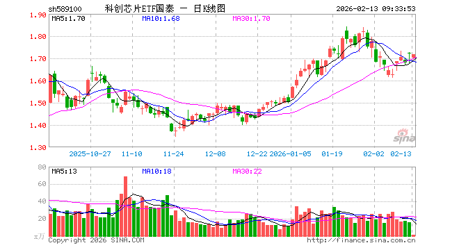 2月13日,科创芯片ETF国泰(589100)开盘跌1.11%,报1.700元。科创芯片ETF国泰(589100)重仓股方面,中芯国际开盘跌0.30%,海光信息跌0.89%,寒武纪跌1.12%,澜起科技跌0.78%,中微公司跌0.63%,拓荆科技跌0.34%,芯原股份跌2.78%,华虹公司跌0.73%,沪硅产业跌0.15%,东芯股份跌0.80%。