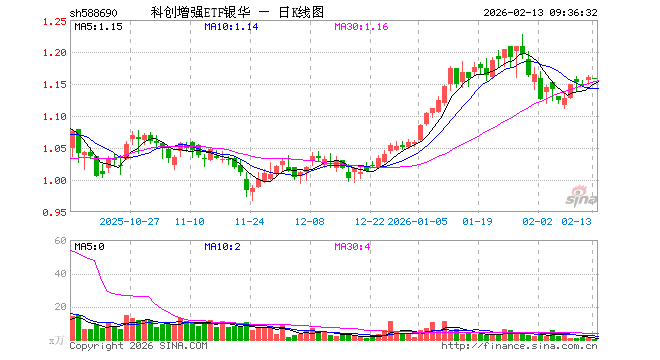 2月13日,科创增强ETF银华(588690)开盘跌0.09%,报1.159元。科创增强ETF银华(588690)重仓股方面,寒武纪开盘跌1.12%,海光信息跌0.89%,中芯国际跌0.30%,中微公司跌0.63%,澜起科技跌0.78%,金山办公跌0.96%,百利天恒跌1.21%,艾力斯涨0.58%,厦钨新能跌1.18%,睿创微纳涨0.00%。
