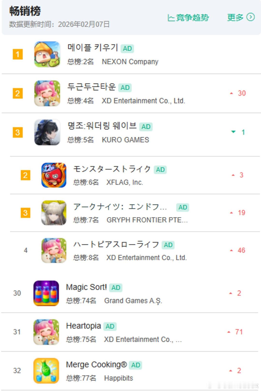 【黄一孟赢大了?“过家家”游戏勇夺日韩畅销榜Top5,日收入超1400万网页链接】上个月,由心动自研自发的《心动小镇》登陆了海外(英文名:《Heartopia》),游戏上线初期冲量可谓相当亮眼,预下载期间就登顶全球50+个国家和地区的iOS免费榜,次日正式开启公测后,游戏仍然稳扎全球16个国家和地区的iOS免费榜第一,且包含美日韩等海外T1级市场。而就在上周六(2月7日),《心动小镇》国际服在版本更新后又在畅销榜全面发力,闯入了多国iOS畅销榜Top10,T1级市场中,日本畅销榜排名甚至冲到了第4名,韩国冲到了第2名,美国也达到31名。