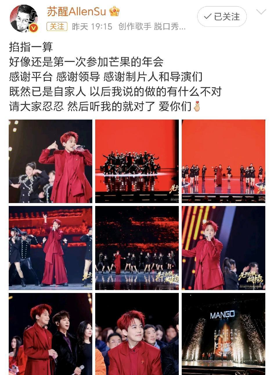 苏醒去参加这个芒果年会有什么意义? 看看金芒作品名单, 披哥五没有, 快乐老友记没有, 全员加速中也没有, 所有他参与的节目都没有,就更不用提金芒主持人了, 所以他去了个寂寞[笑哭]! 但凡是个有骨气的,也该讲好了条件再去吧,怎么在节目里硬气了一年,到收官了彻底投降了[捂脸]! 还是说芒果年会的酒好喝[可怜]苏醒