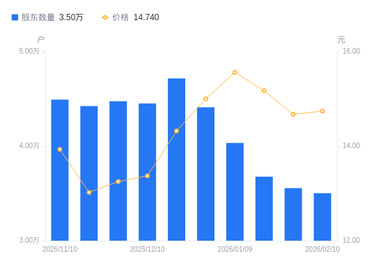 近一年(2025年2月10日至2026年2月10日),万安科技A股股东户数从4.95万户,减低至3.5万户,降幅29.30%,区间股价上涨13.65%。