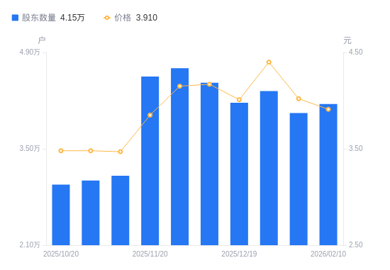 日期A股户数(户)流通A股户均持股数(股)户均持股市值(万元)2026-02-104150031596.3112.352026-01-304020032618.0913.112026-01-204340030213.0613.292025-12-194170031444.7712.612025-12-104460029400.1612.262025-11-284670028078.0911.652025-11-204550028818.6211.102025-11-103110042162.2814.632025-10-313040043133.1315.012025-10-202980044001.5815.31
