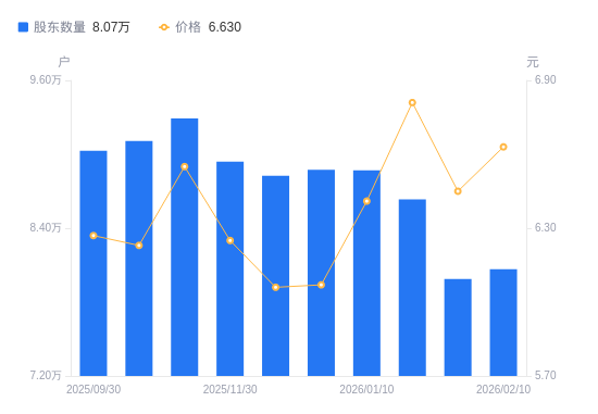日期A股户数(户)流通A股户均持股数(股)户均持股市值(万元)2026-02-108067021863.4314.502026-01-317988222079.1014.242026-01-208633620428.5913.912026-01-108870719882.5712.742026-01-018873919875.4012.062025-12-208826519982.1312.112025-11-308939419729.7712.332025-11-109291318982.5212.432025-10-209108519363.4812.062025-09-309029519532.9012.25