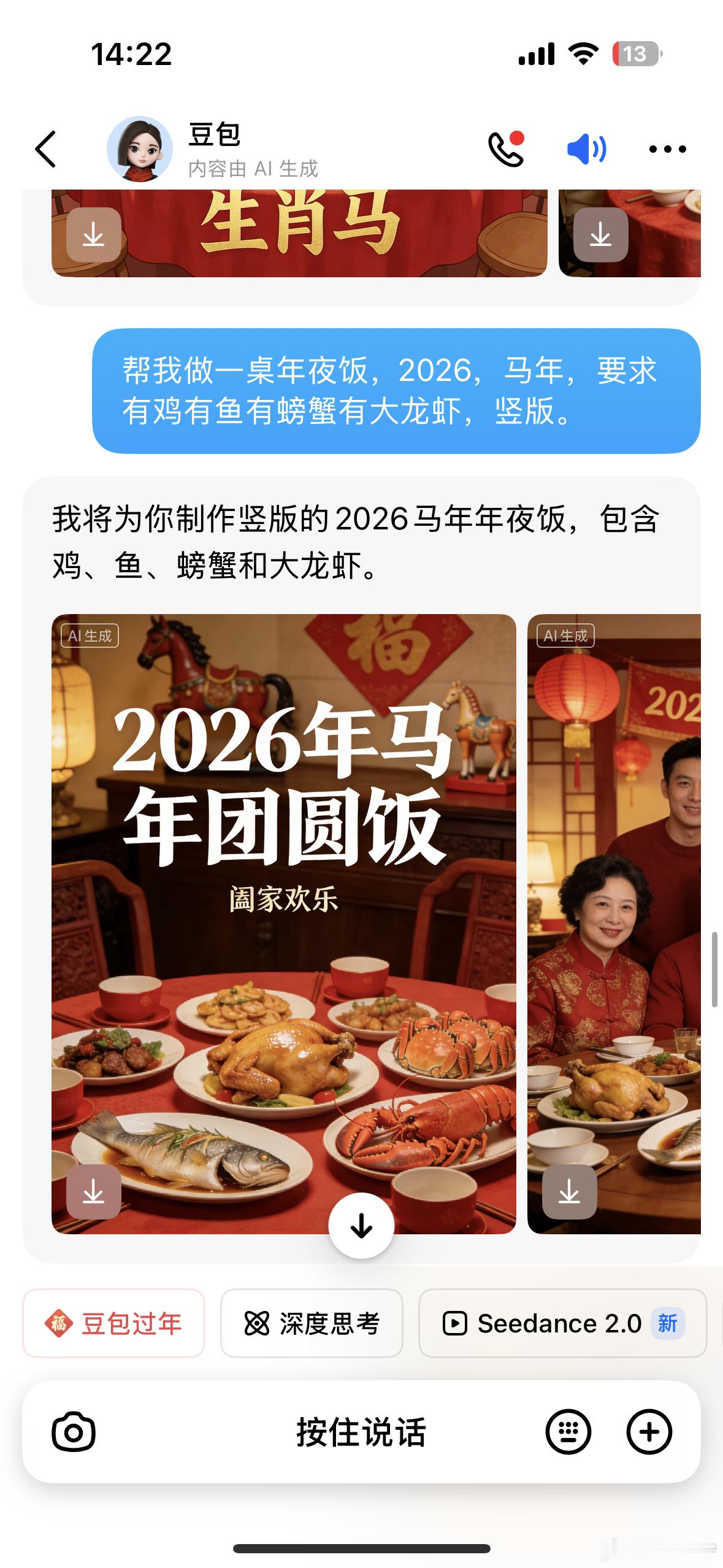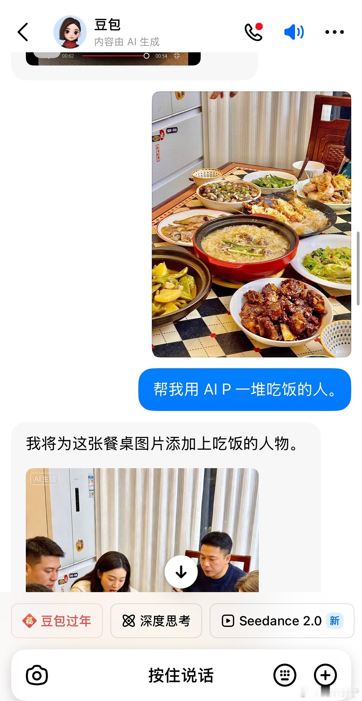 美食AI真香大赛春节AI美食 这次不用愁没人陪你吃年夜饭了,AI在线摇人,要啥有啥,连丈母娘都给你摇来了昨天拍的菜看着单调,告诉AI,“帮我P一堆吃饭的人”,立马就来了,哈哈😂“帮我P一个和我碰杯的人”也能马上到位拍照背景不好看也可以交给AI,果然比我自己拍的好最绝的是年夜饭,鸡鸭鱼肉大龙虾,想啥来啥。过去有一句话叫“梦里啥都有”现在是AI都能帮你实现
