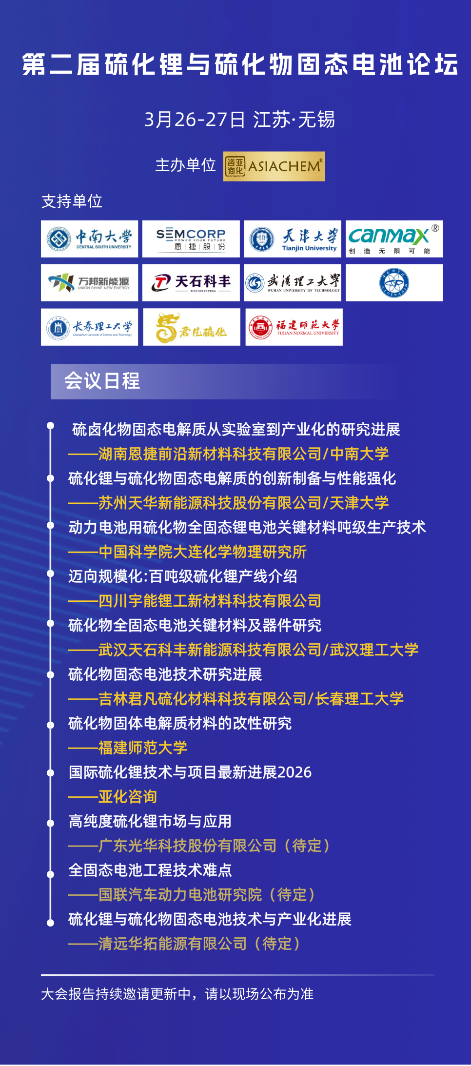 第二届硫化锂与硫化物固态电池论坛将于3月26-27日在无锡召开