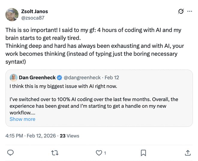 有程序员在X上吐槽:“用AI写代码4小时,脑子就开始特别累。深度思考向来很耗神,有了AI之后,工作就完全变成了纯粹的思考。”