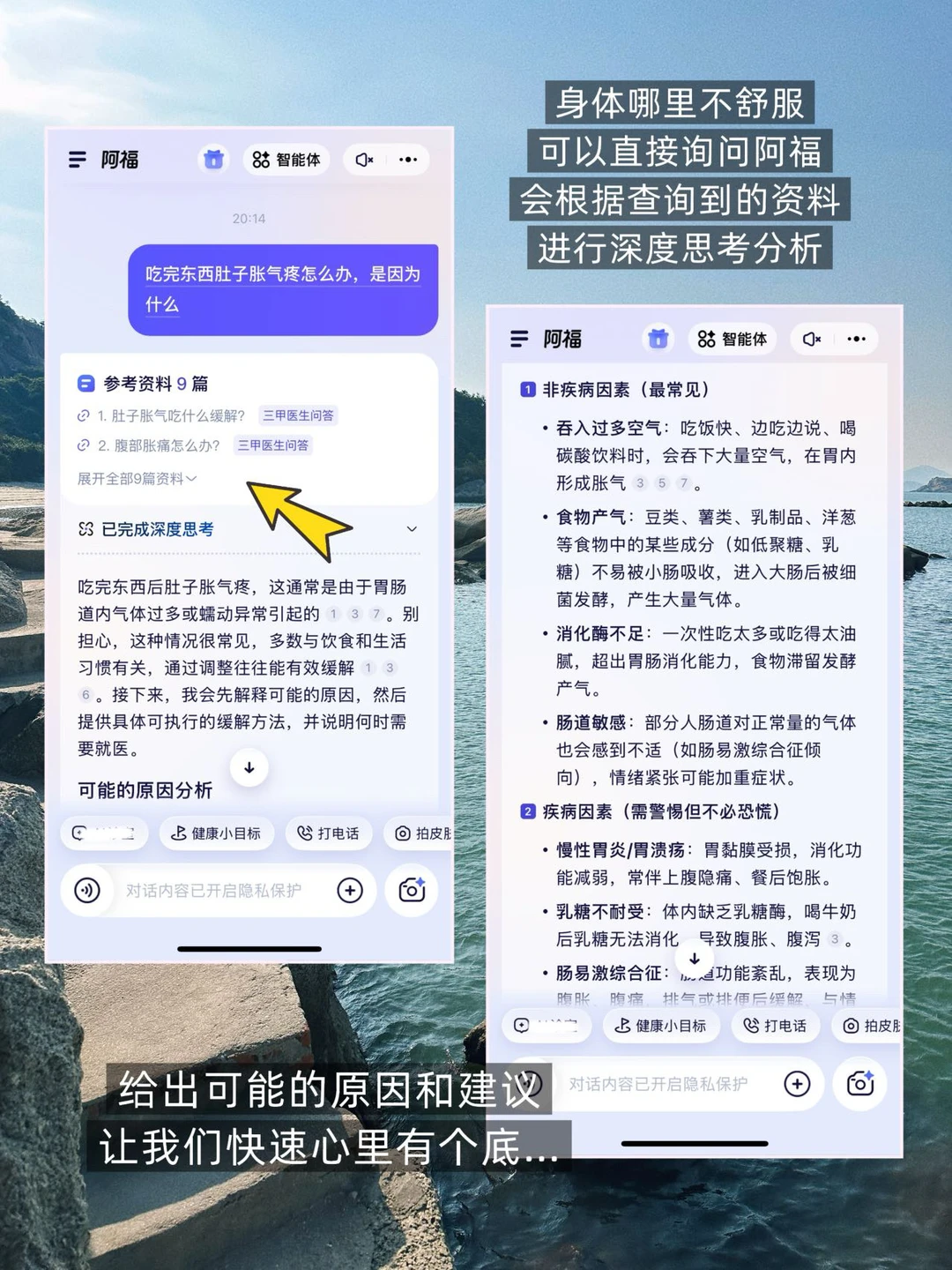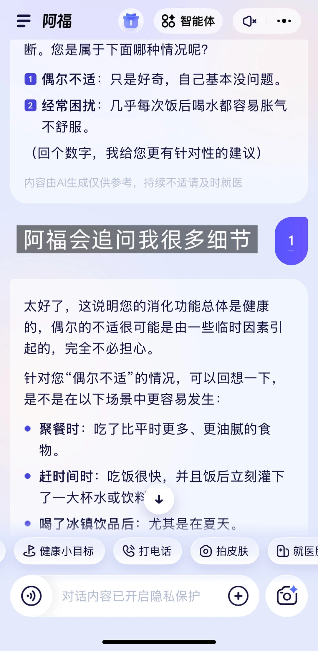 阿福最让我心动的一点:完全没广告! 而且它不仅仅是回答,它会主动追问”。比如我说“肚子疼”,一样问我是隐痛还是绞痛、吃了什么、持续多久。通过好几轮对话,理清思路,再给到处理的办法,跟🧑⚕️说的差不多~