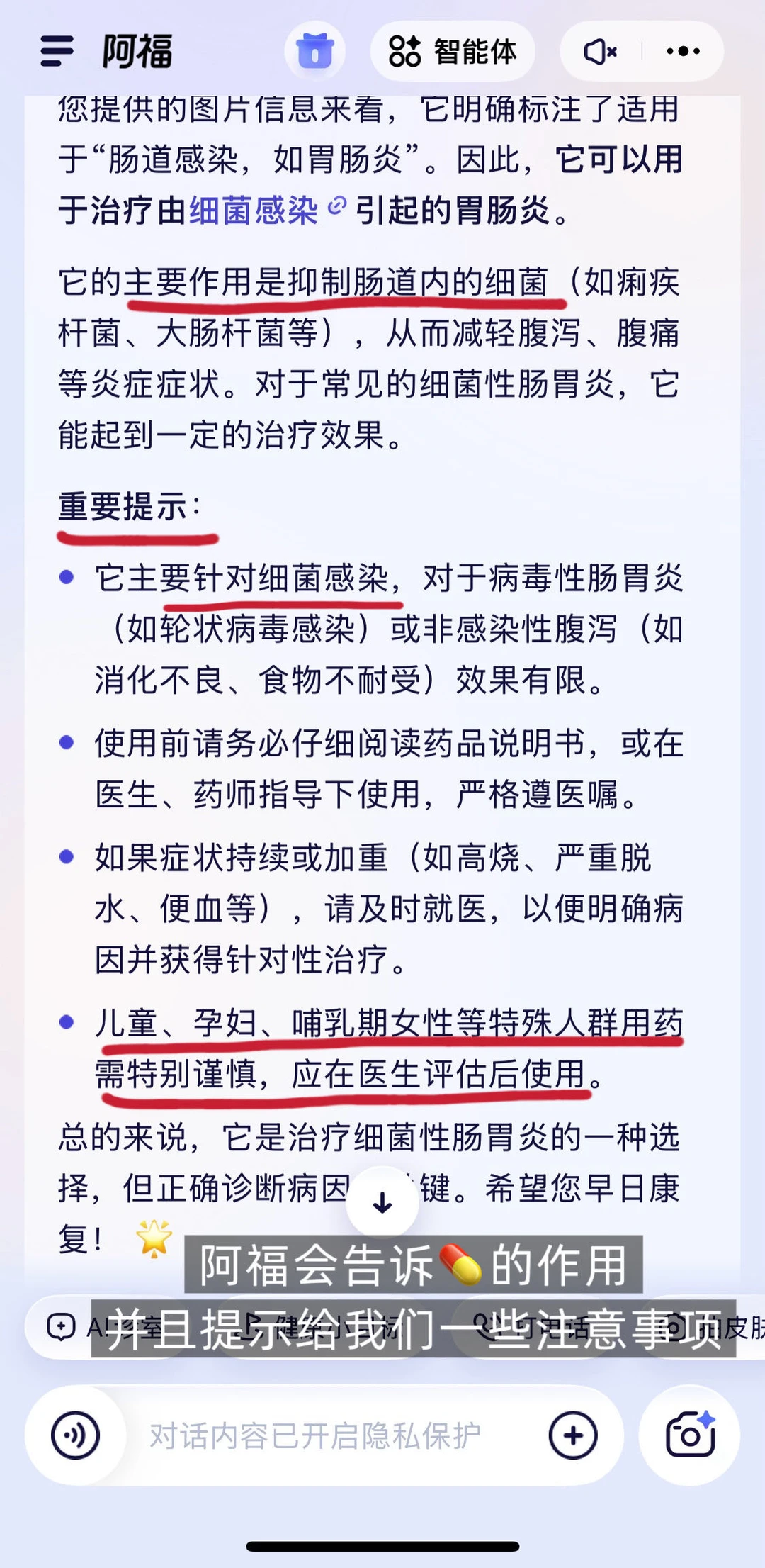 还有一个超级好用的拍一拍功能📸:爸妈看不懂的体检报告、分不清的药盒,拍一下,阿福立马就能解释得明明白白,还能提醒用药禁忌,简直是子女的替身小棉袄[派对R]
