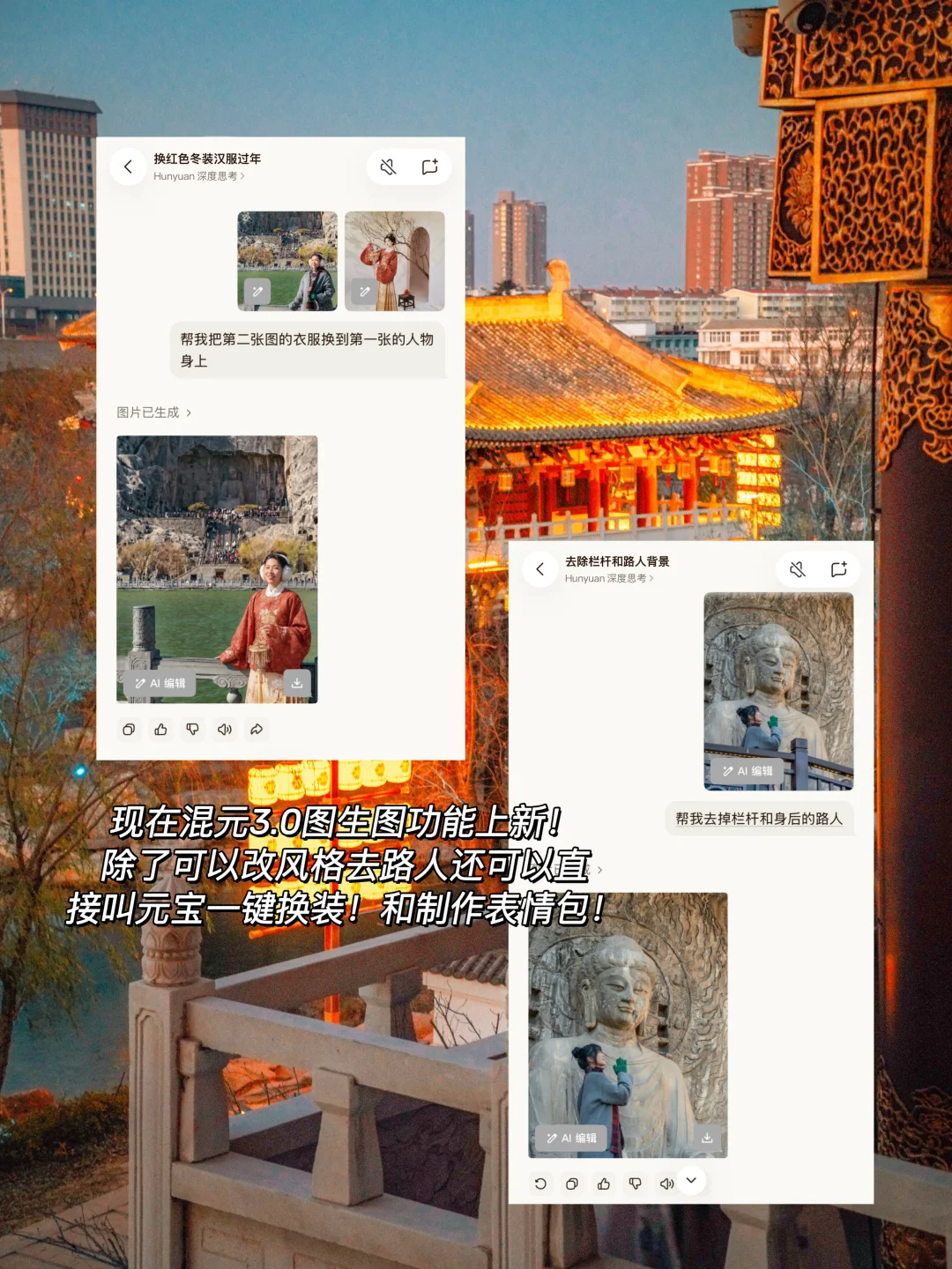 ✔️元宝的修图也超给力,拍的照片路人太多,上传图片语音指令"去除路人并调成有质感的大片",一秒出片,也不用费心思调色后期!