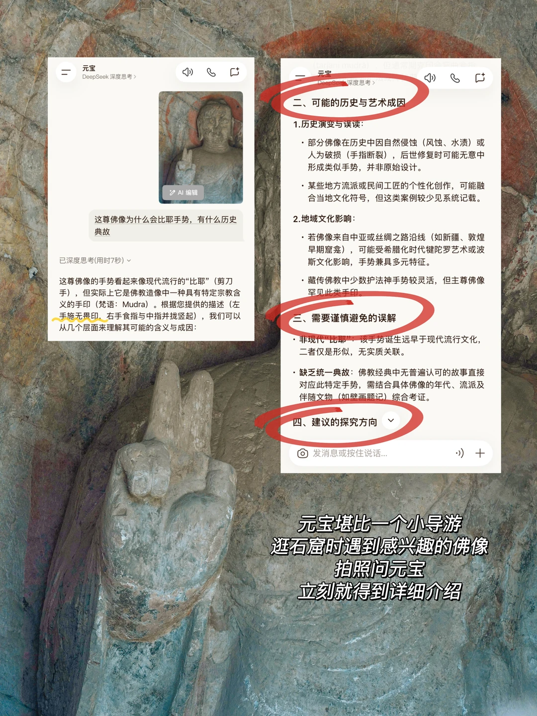 ✔️逛逛石窟时拍下照片发给元宝,不仅识别出“比耶佛像”,还进行了讲解,不输专业导游;逛博物馆时直接用元宝的AI打视频功能对准展品,元宝仿佛讲解员化身,沉浸式了解展品背景与特点