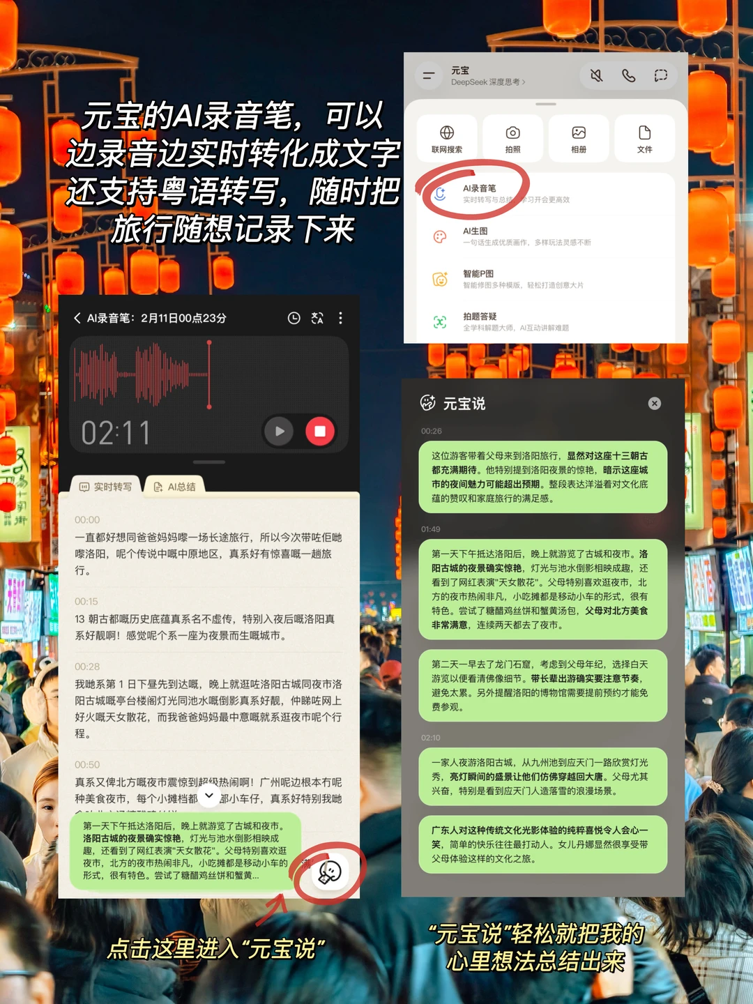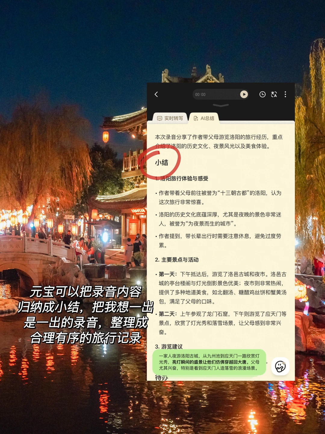 ✔️元宝的AI录音笔也很喜欢,只要大致跟元宝讲一下旅游感受,它就会自动帮我生成一篇旅游小结,读懂我的深层意思,还可以根据录音,生成不同风格的文案真的很棒👍🏻