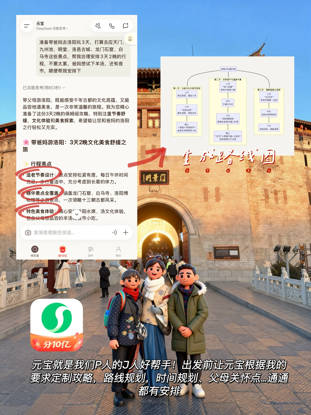 都说带爸妈旅游会特别费神,我让元宝帮忙定制这条洛阳3天2夜游玩路线,玩完回来,爸妈都表示十分满意👍🏻