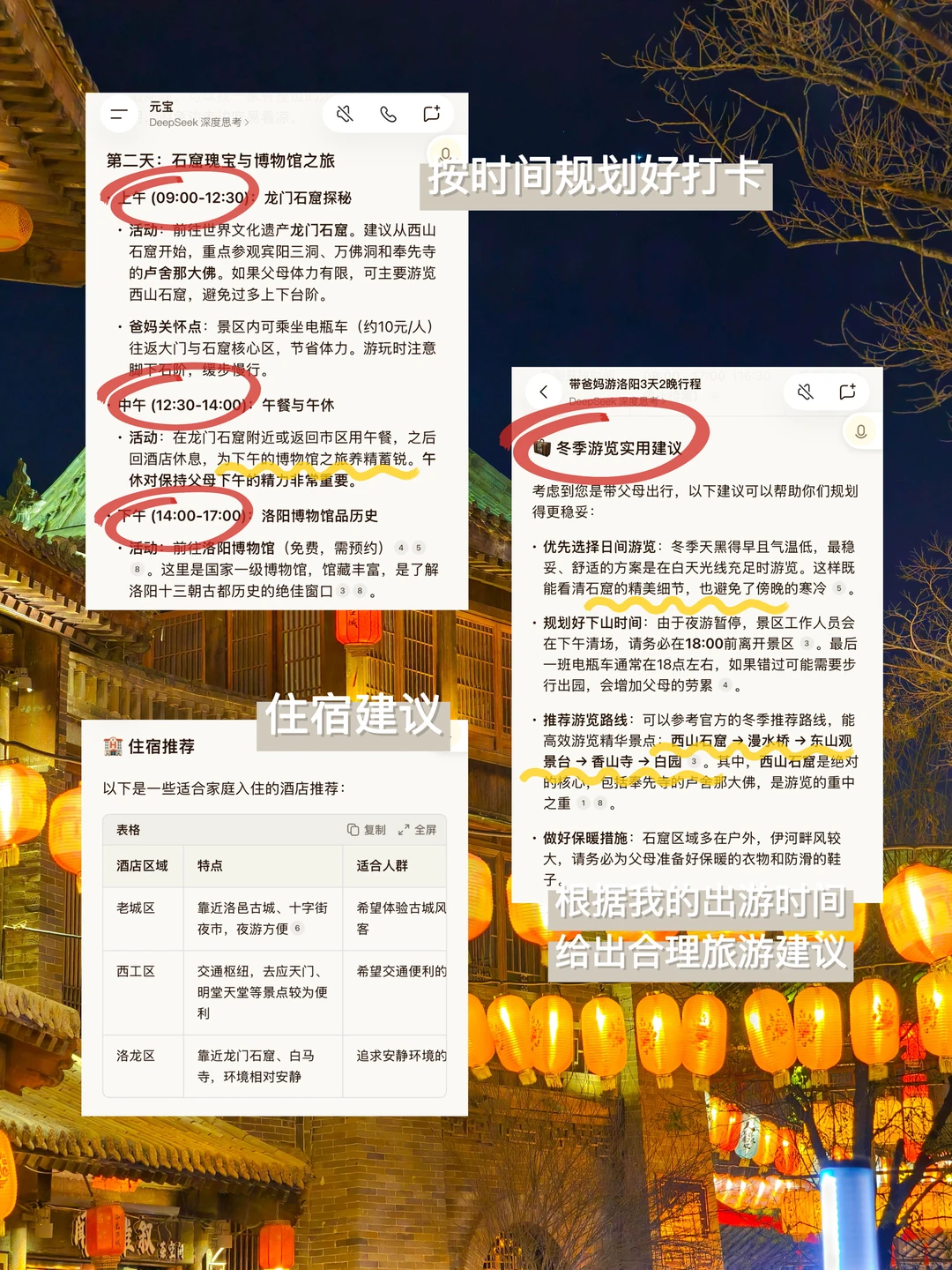 ✔️出发前定制行程,秒出详细攻略,还标清停留时间,而且好懂带长辈出行的需求,每天的安排都很合理,不会特种兵~还通过元宝AI搜索得知,大湾区游客去洛阳可以办90元年卡,立马省下不少门票钱!