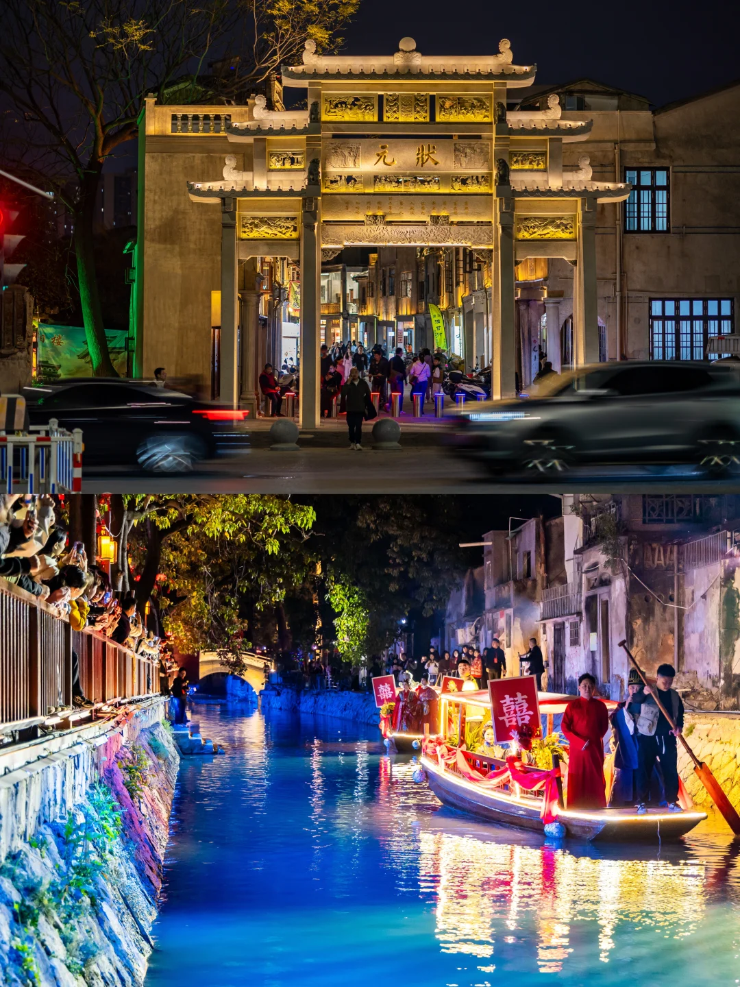 六座古桥流光溢彩,花船缓缓驶过