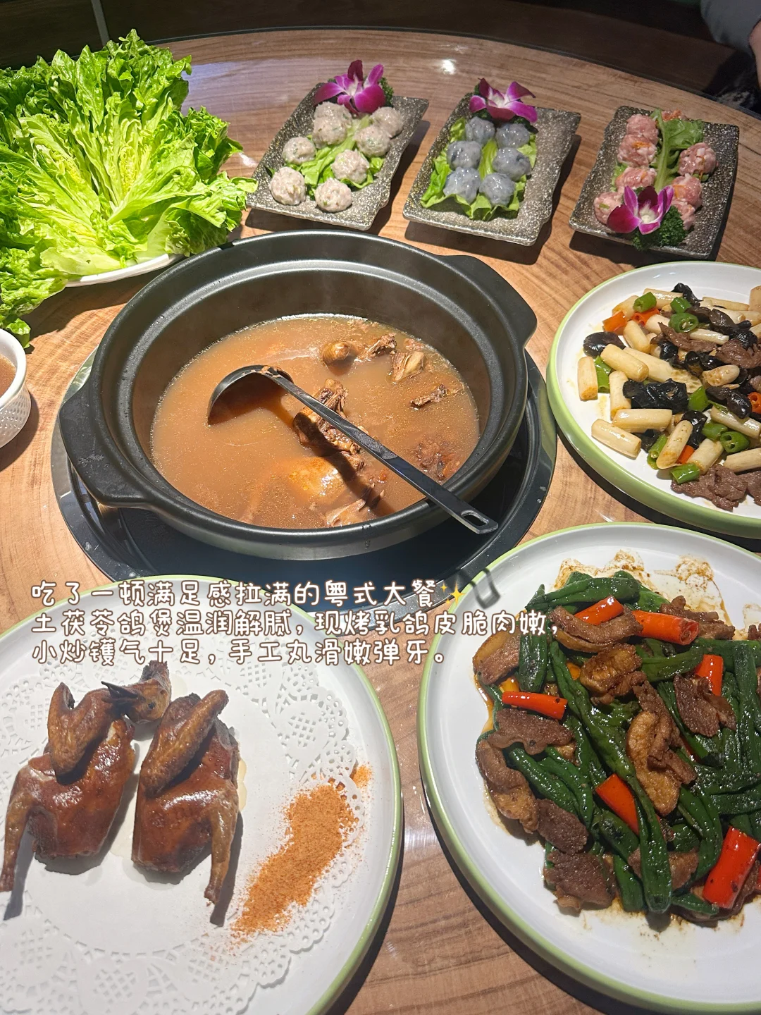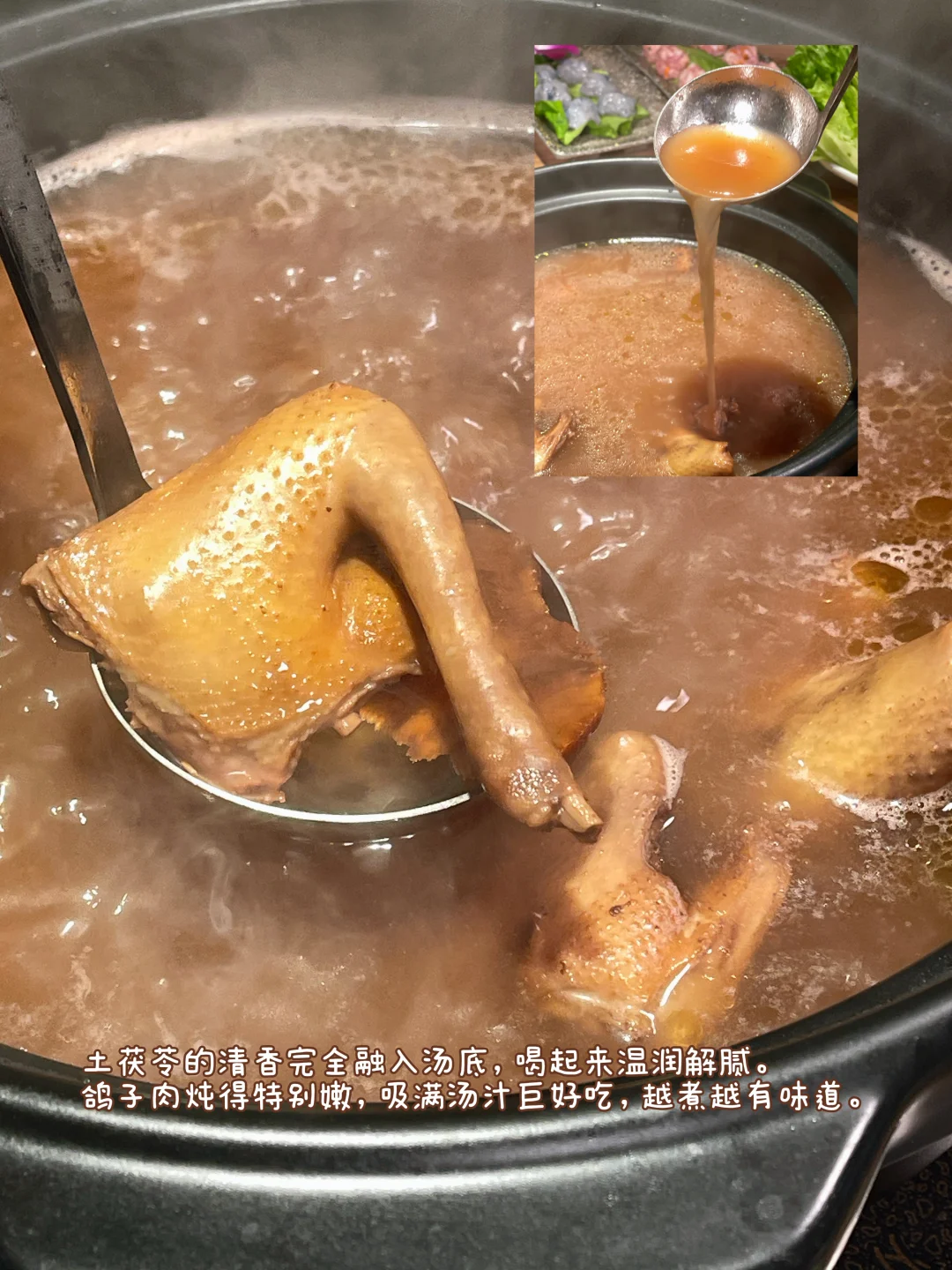 吃上了!!吃上了!!虽然年后才正式开业,但现在也可以吃上啦!!真的就是熟悉的老味道呀,跟中山店简直一模一样~ 店内包厢原木风格,空间有600平方,特别大,好适合约年夜饭!! ✨ 必点招牌:土茯苓鸽子煲 土茯苓的口味真的好好喝呀!!喝起来温润又解腻。鸽子肉炖得特别嫩,吸满汤汁巨好吃,越煮越有味道。 还有鸽子肉外皮烤得焦糖色,肉质嫩到骨子里,蘸上干碟香到舔手指。 📍 地址:珠海横琴创新方-中山一煲鸽(横琴分店)