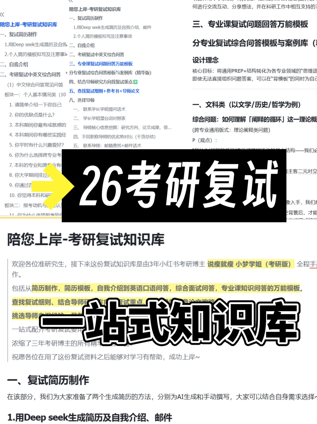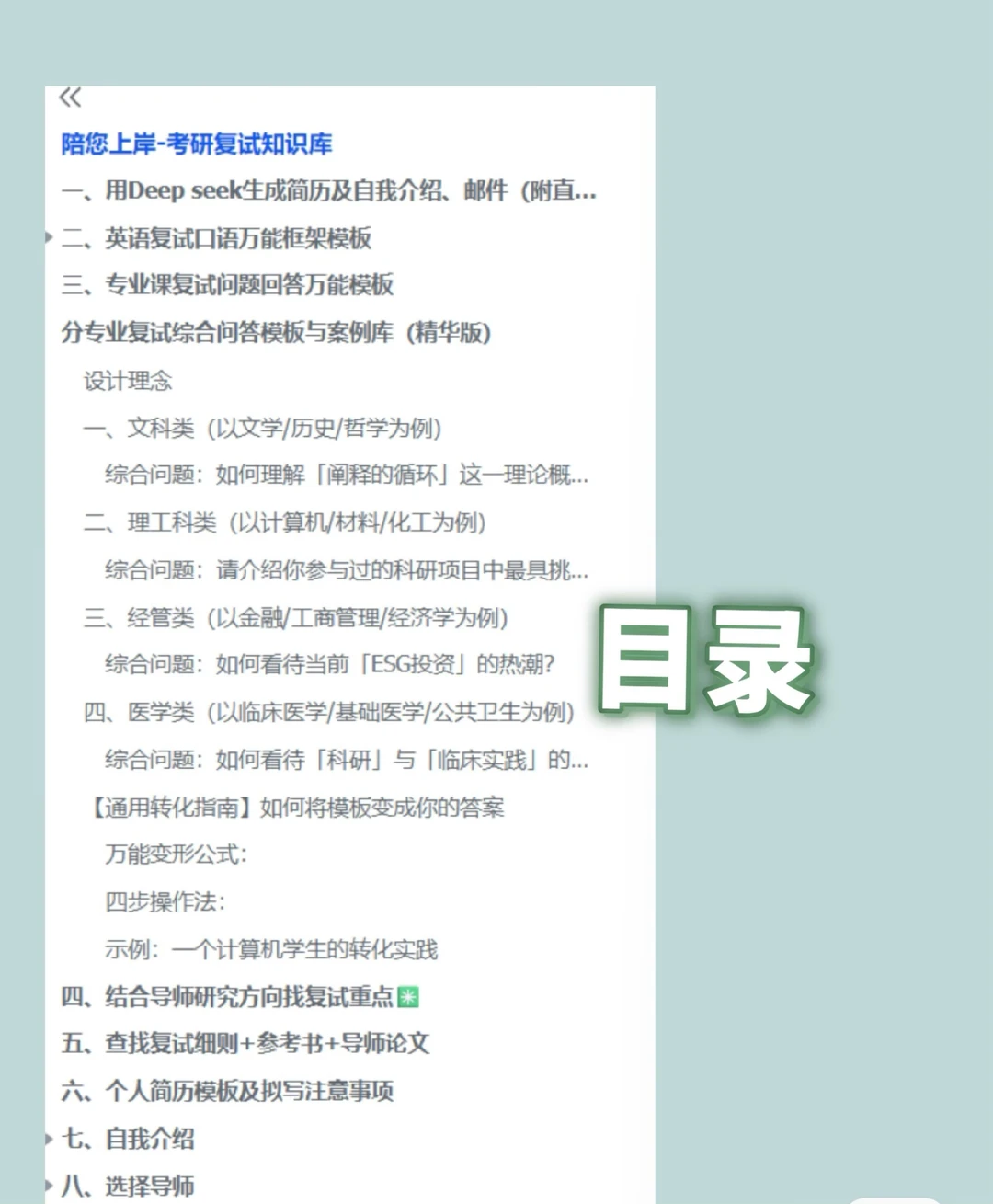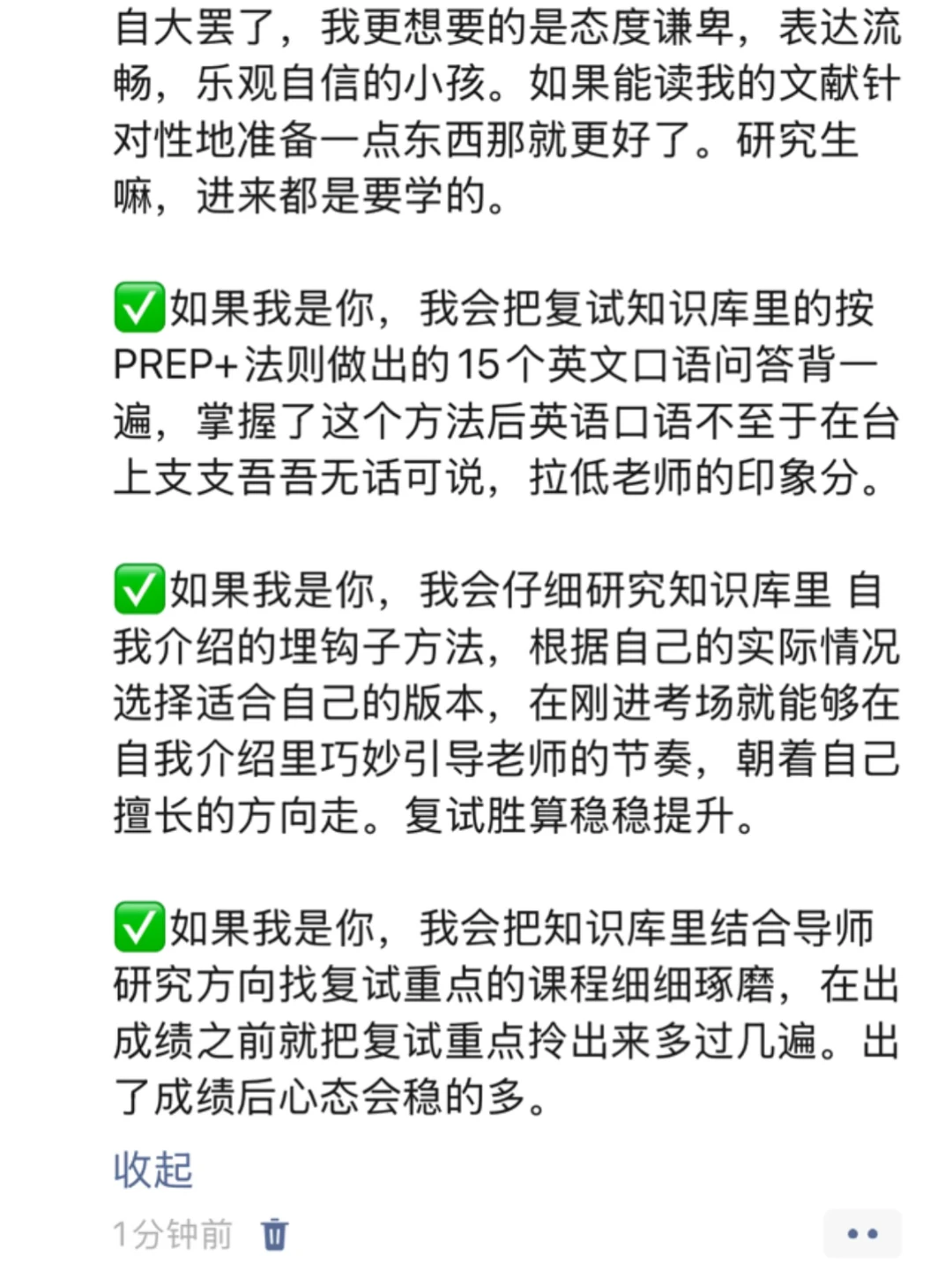 如果我是你,我会仔细研究知识库里 自我介绍的埋钩子方法,根据自己的实际情况选择适合自己的版本,在刚进考场就能够在自我介绍里巧妙引导老师的节奏,朝着自己擅长的方向走。复试胜算稳稳提升。