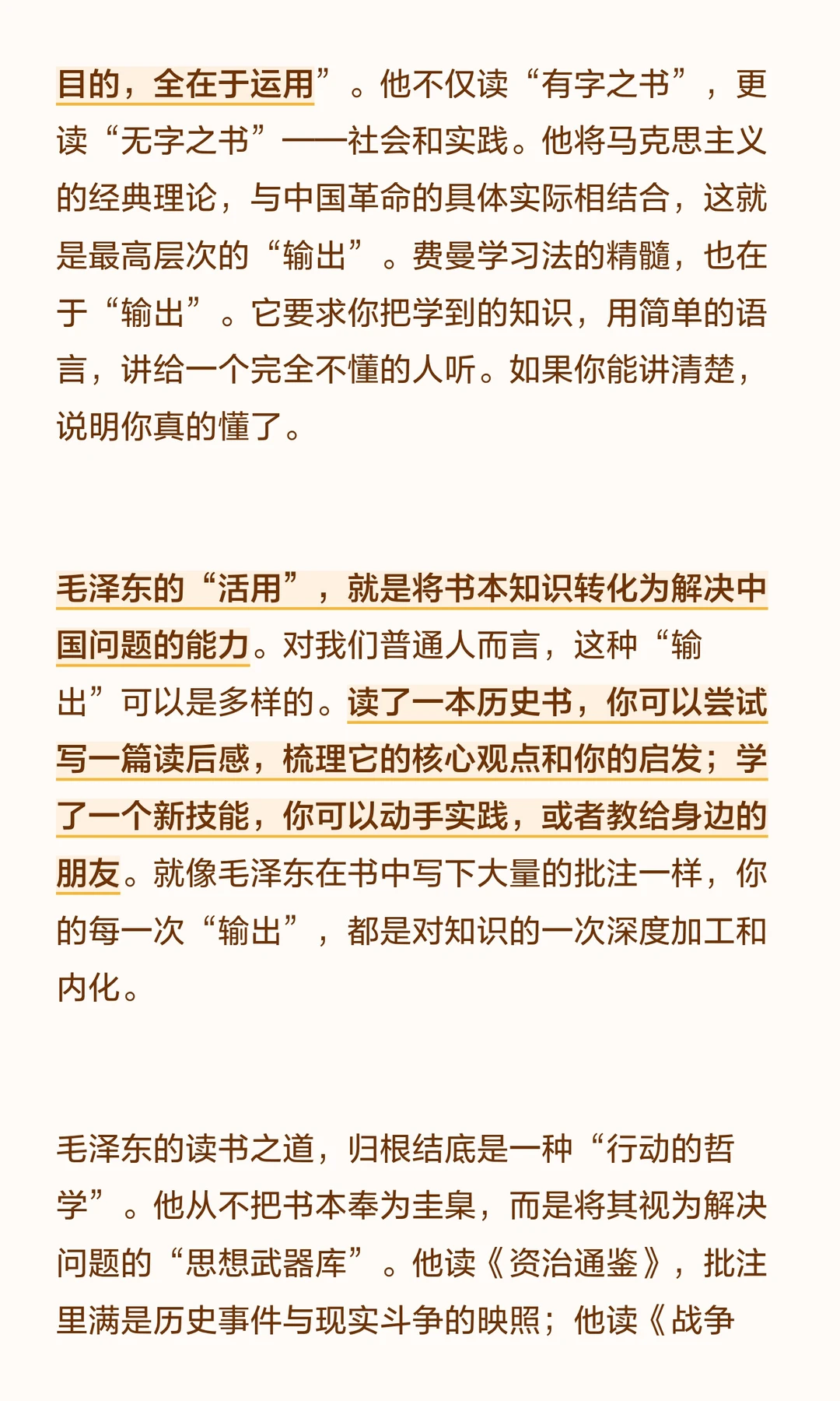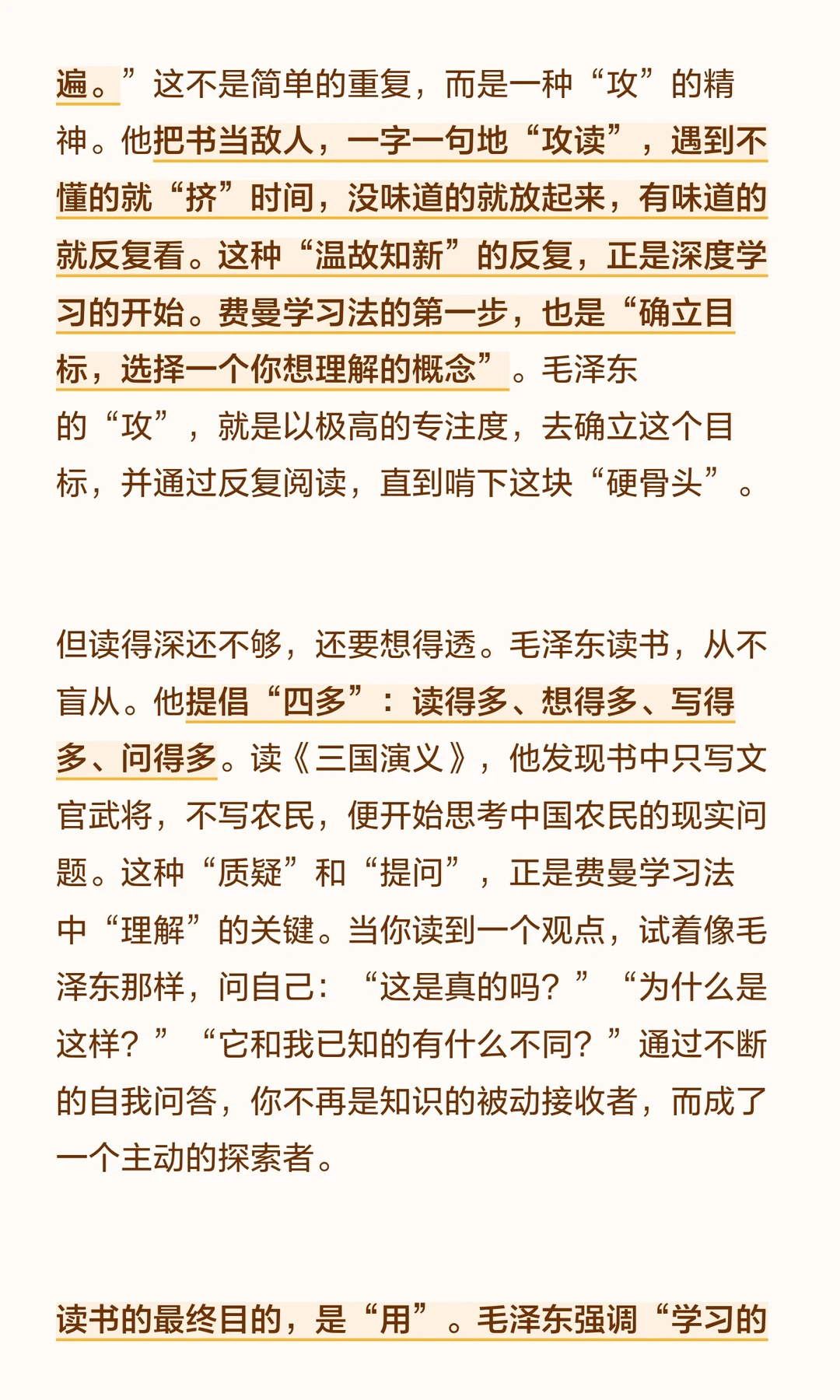 但读得深还不够,还要想得透。毛泽东读书,从不盲从。他提倡“四多”:读得多、想得多、写得多、问得多。读《三国演义》,他发现书中只写文官武将,不写农民,便开始思考中国农民的现实问题。这种“质疑”和“提问”,正是费曼学习法中“理解”的关键。当你读到一个观点,试着像毛泽东那样,问自己:“这是真的吗?”“为什么是这样?”“它和我已知的有什么不同?”通过不断的自我问答,你不再是知识的被动接收者,而成了一个主动的探索者。