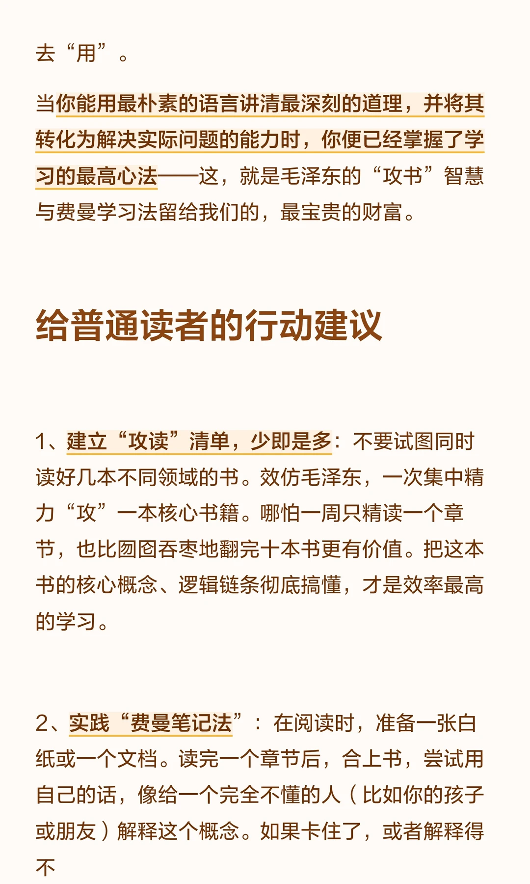 读书应像毛泽东“攻书”般专注,反复咀嚼,质疑权威,通过费曼学习法将知识转化为能讲给他人理解的输出,最终转化为解决实际问题的能力。
