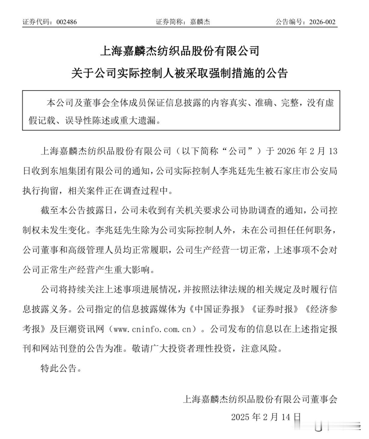 嘉麟杰实控人涉法律程序,已被石家庄市公安局执行拘留 嘉麟杰(股票代码:002486)于2026年2月14日发布公告称,公司实际控制人李兆廷先生因涉嫌相关案件已被石家庄市公安局执行拘留,目前案件正处于调查阶段。公告同时明确指出,李兆廷先生并未在公司担任任何职务,因此公司经营层及高管团队运作一切如常,日常生产与业务活动未受任何影响。公司控制权结构稳定,未因本次事件发生变化,且未收到任何协助调查的通知。 面对突发状况,嘉麟杰在公告中重申,公司董事会及管理层将持续勤勉履职,确保公司战略执行与经营目标的稳步推进。公司亦承诺将密切关注事件进展,严格按照监管要求履行信息披露义务,保障投资者知情权。 尽管实控人涉及法律程序,嘉麟杰通过及时公告传递核心信息,意在向市场释放明确信号:公司治理结构与业务独立性完备,风险隔离机制有效,此次事件不影响公司主体运营。分析人士指出,在纺织服装行业竞争加剧的背景下,嘉麟杰能否持续强化其功能性面料及成衣业务的竞争力,或将成为市场关注焦点。