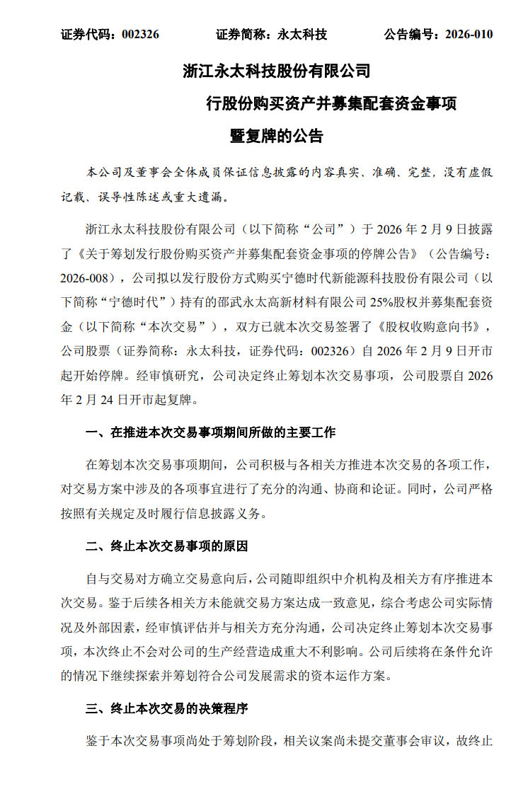 据悉,5天前的2月8日,永太科技公告称,公司拟以发行股份方式购买宁德时代持有的永太高新25%股权并募集配套资金。公司现持有该标的公司75%股权。本次交易完成后,宁德时代将成为公司股东。公司股票自2026年2月9日开市起开始停牌。公司预计在不超过10个交易日的时间内披露本次交易方案。