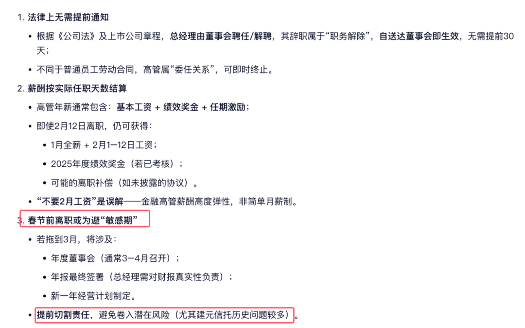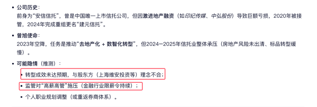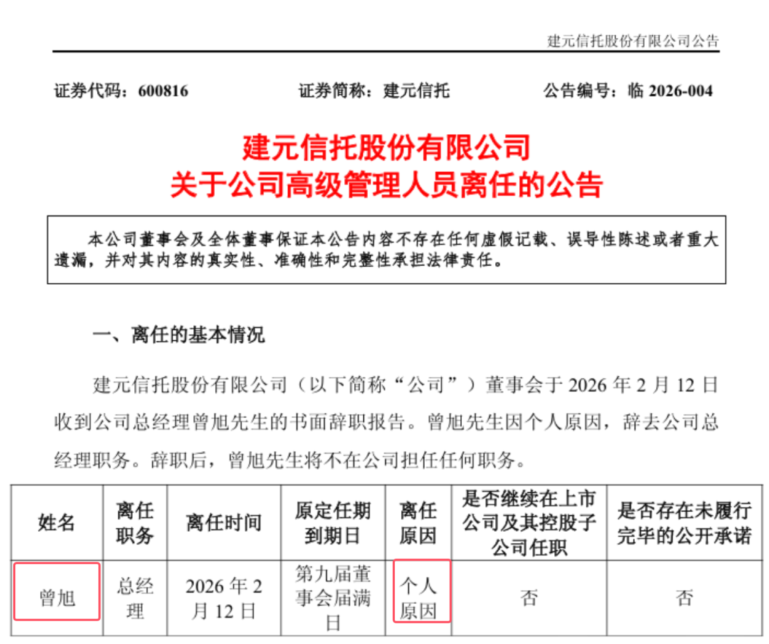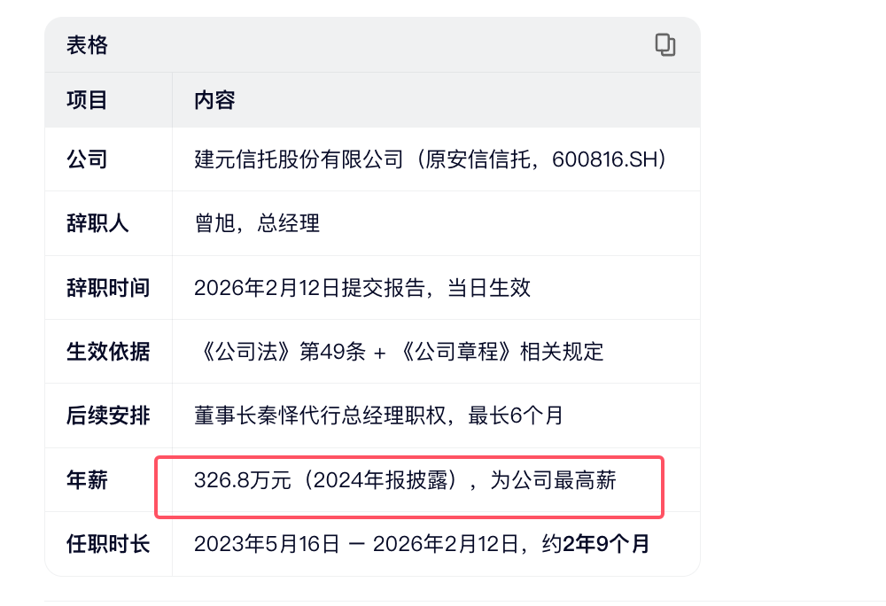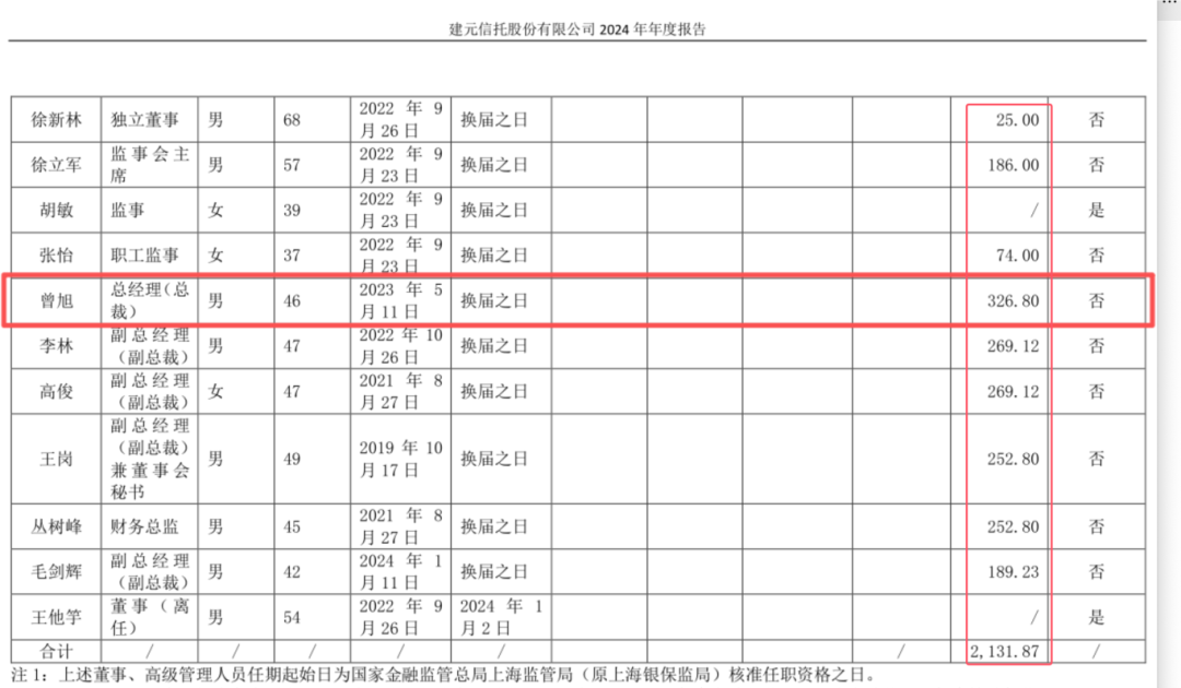 1、建元信托工资最高的总经理曾旭辞职!公开资料显示,曾旭2023年9月担任总经理,到今天不满3年,2023年3月16日建元信托(当时仍称“安信信托”)召开第九届董事会第六次会议,审议通过《关于聘任公司总经理(总裁)的议案》,同意聘任曾旭为公司总经理。公告明确:“任期自本次董事会通过之日起至第九届董事会任期届满之日止,到期可以续聘。本来任期应该到2025年9月22日(三年任期)。
