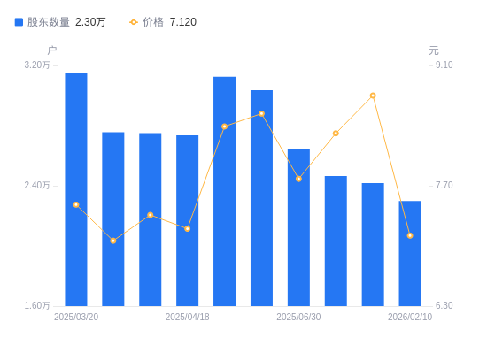 日期A股户数(户)流通A股户均持股数(股)户均持股市值(万元)2026-02-102299015888.2311.312025-09-302417915106.9313.222025-07-312464214823.0812.322025-06-302644213814.0210.752025-05-303035612032.8910.282025-05-203124711689.779.812025-04-182735413353.459.612025-04-102750613279.669.772025-03-312755713255.089.362025-03-203153411583.388.66